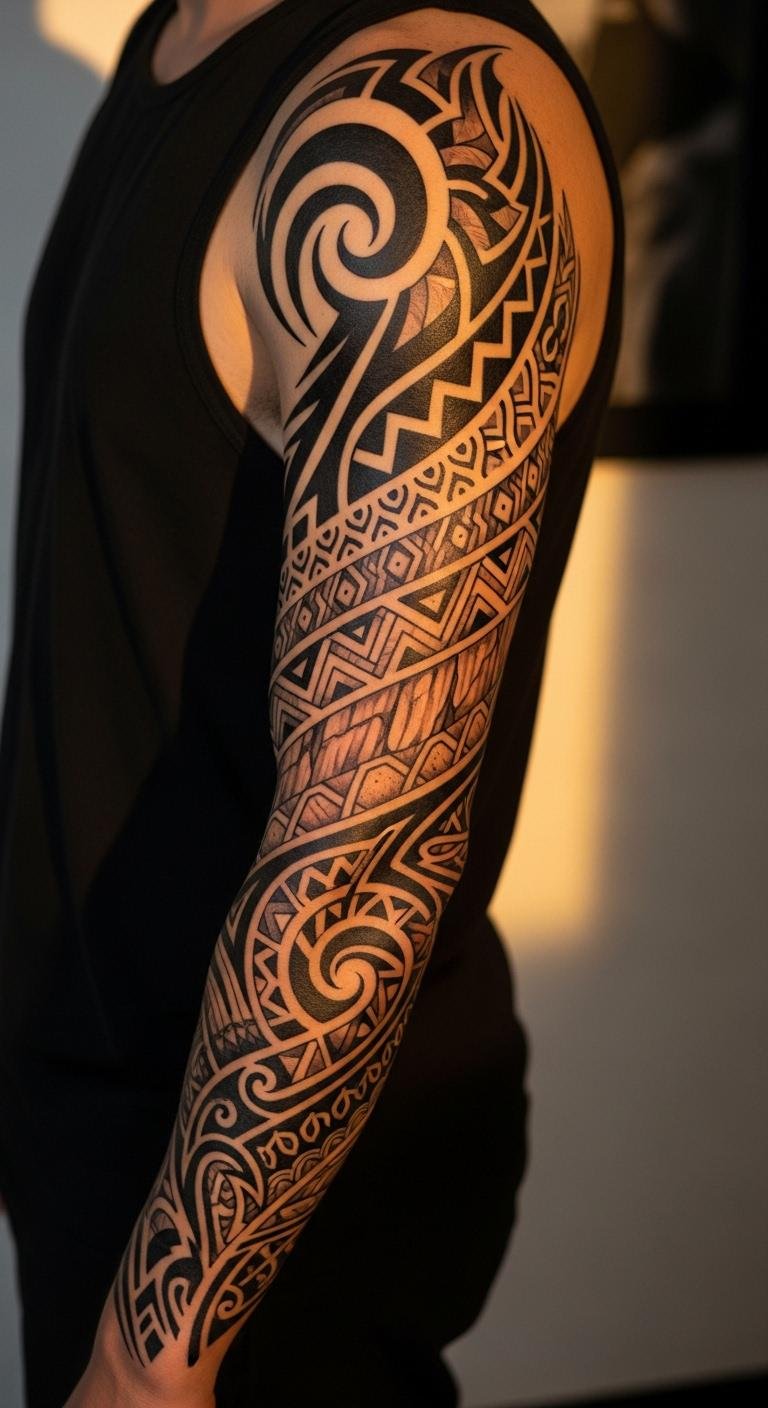 A neo-tribal sleeve tattoo blends old patterns with fresh twists for a bold story. Imagine swirling lines that flow from shoulder to wrist. This style tells your background in ink. Draw inspiration from simple online tutorials to sketch ideas at home. Artists might charge $150 for a small section, keeping it affordable. Use household items like a marker for a trial run on your skin. Focus on areas that heal fast, like the forearm. Add colors with cheap markers first to test. This design fits under clothes for work days. Pair it with easy care routines, like gentle soap from your kitchen. Make it unique by mixing in family symbols. Sessions can be quick, so plan for less pain. Overall, it adds a personal layer to your look.
