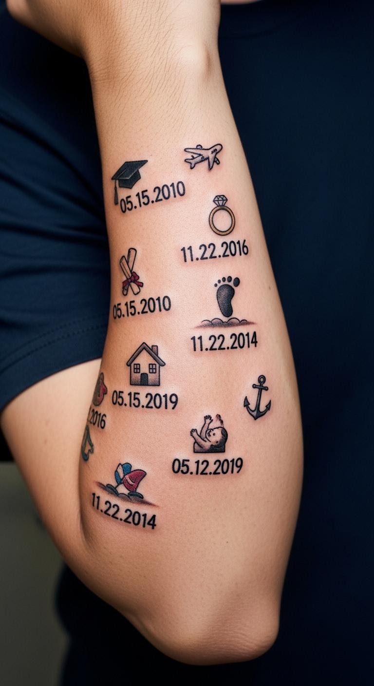A personal milestones sleeve marks life events, like dates on your arm. Envision numbers for memories. Jot dates in a notebook. Costs vary, but start small. Use calendar apps for ideas.