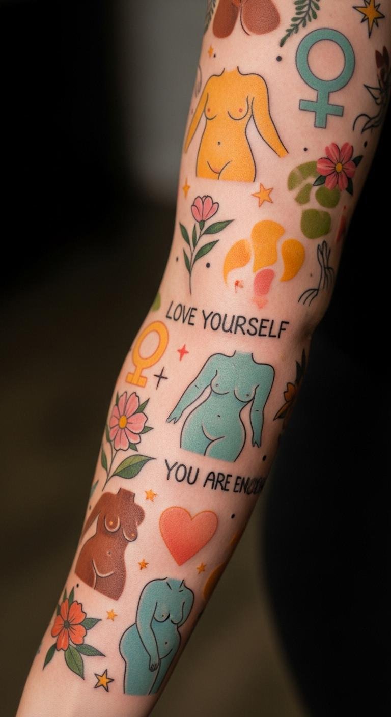 A body positivity themes sleeve celebrates you, with positive icons on your arm. Choose motifs that resonate. Keep it simple and affordable.