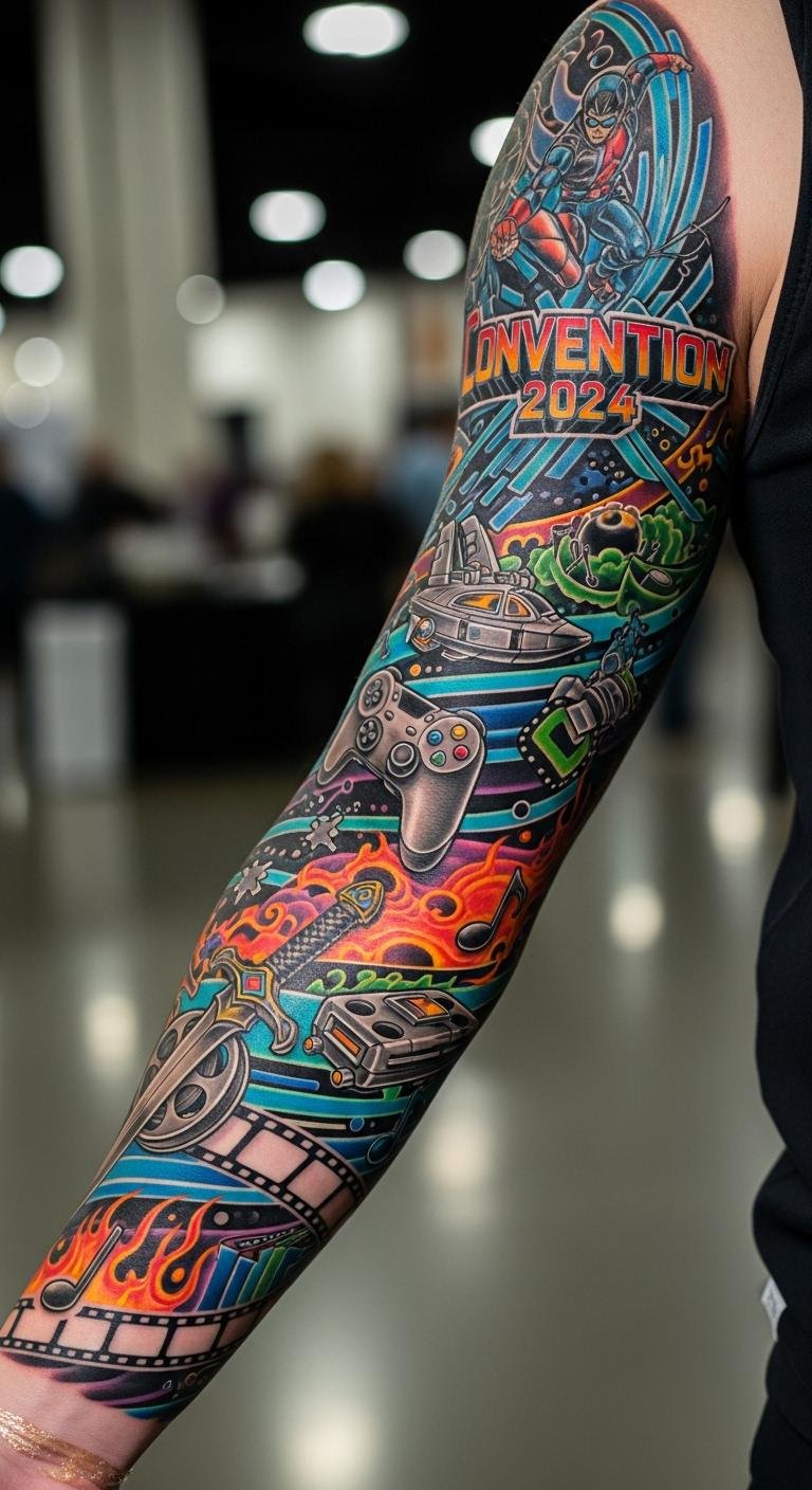 A convention-inspired sleeve draws from events, with fun themes on your arm. Look at expo ideas. Plan visits for inspiration.