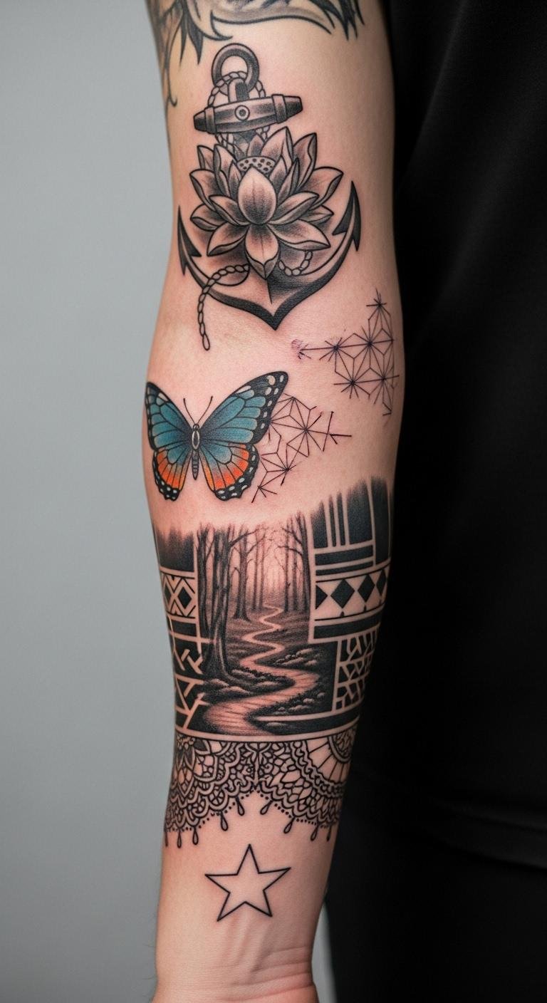 A minimalist linework sleeve keeps things elegant with just a few strokes. Think of thin lines forming stars or waves along your arm. It’s perfect for a subtle change. Grab a pen and paper to doodle designs yourself. Many shops offer this for under $100, making it easy on your wallet. Practice with temporary tattoos from a dollar store. Place it on less sensitive spots for comfort. Use free apps to preview how it might look. This tattoo hides under sleeves for professional settings. Maintain it with basic cream you already own. Customize by adding a meaningful line or two. Keep appointments short to fit your schedule. It grows with you over time.