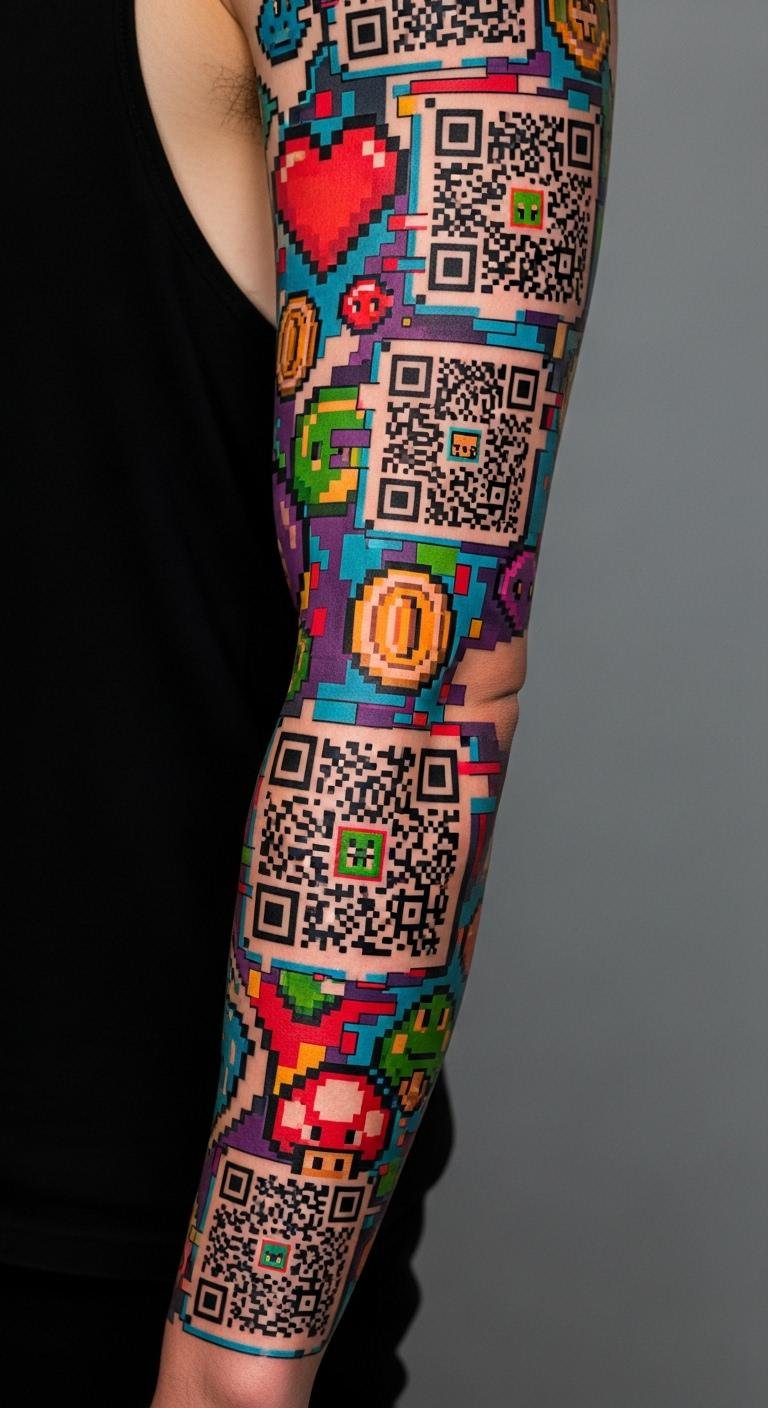 A digital-age icons sleeve features tech elements like pixels or codes on your arm. Picture a QR design that links to your world. Sketch pixels using graph paper at no cost. Shops might do this for $180, keeping it budget-friendly. Experiment with phone apps for virtual designs. Place it on the outer arm for quick healing. Add simple pixels with markers first. This tattoo mixes fun with function. Use regular bandages for aftercare. Personalize by including your favorite app icons. Sessions can be split to save money.