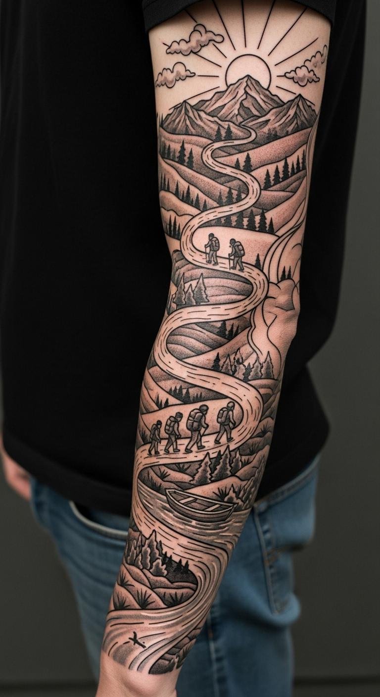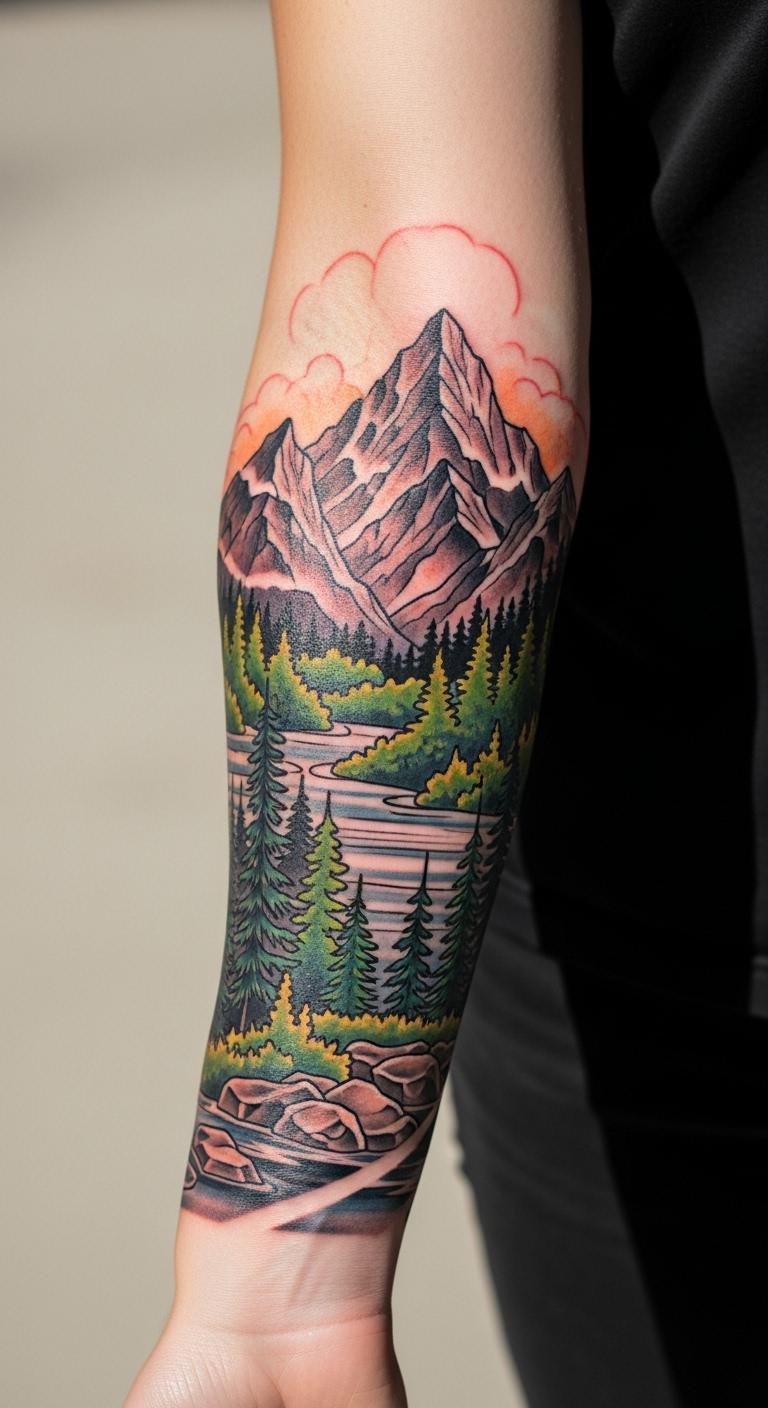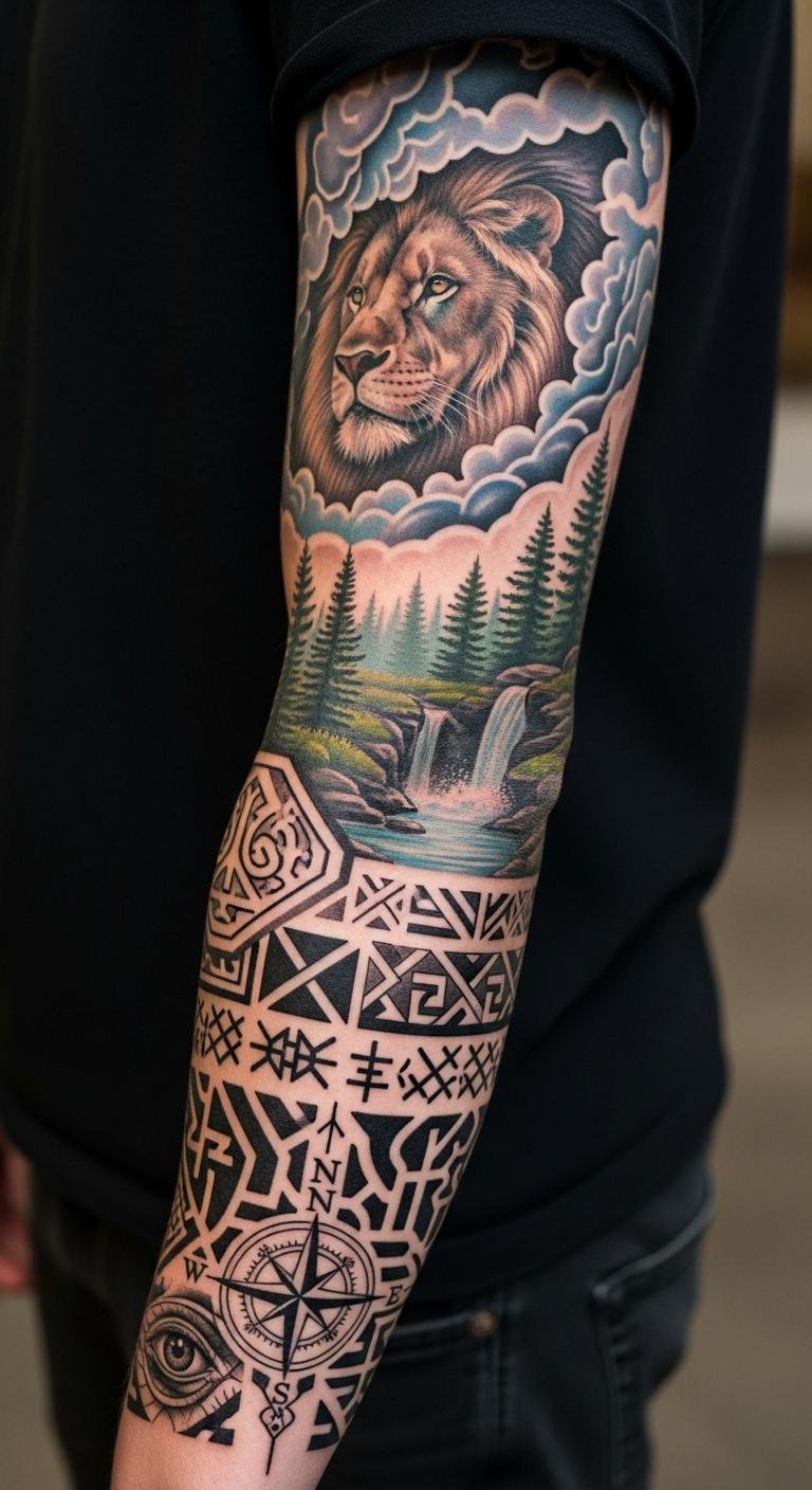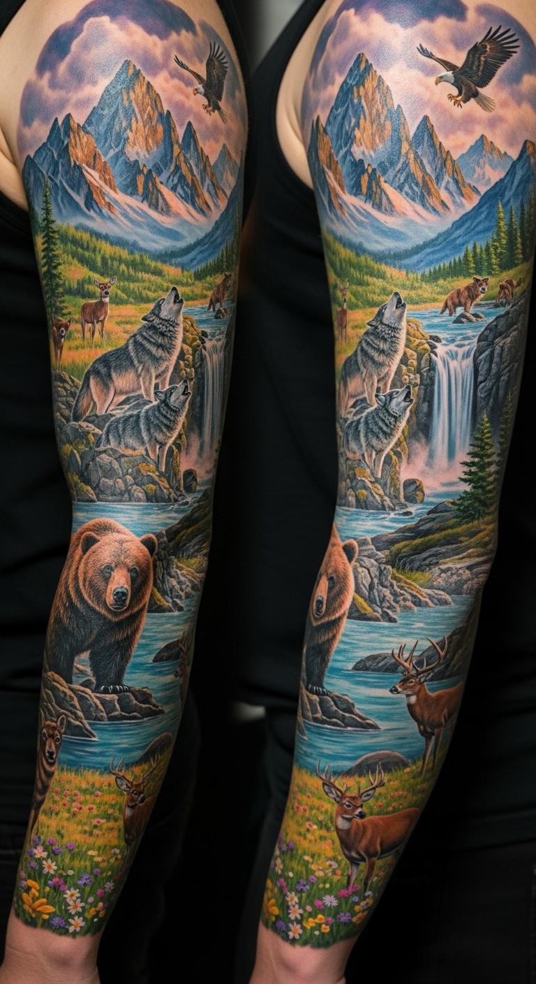 Combine animals with landscapes for a dynamic sleeve. Layer scenes thoughtfully. Sketch combos at home. Get free landscape ideas. Opt for affordable tattoos. Position for balance. Include meaningful animals. Prepare for pain simply. Care with basics. Affordable creativity shines.