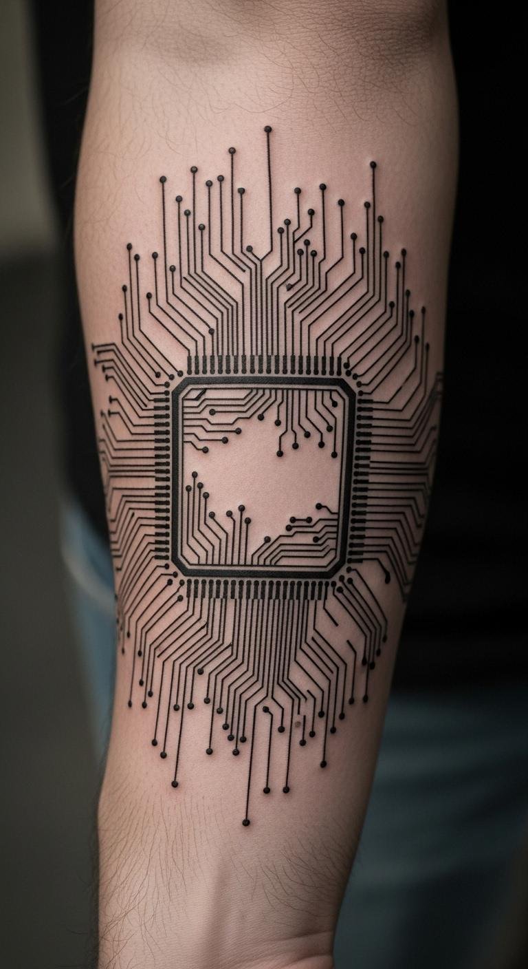 Digital vibes bring modernity. Etch circuits on your forearm. Copy from tech images. Draw with electronic tools at home. Apply digital prints temporarily. Seek tech-themed artists. Use line art to save. Start: research circuits, sketch, try. This design will connect with your interests.