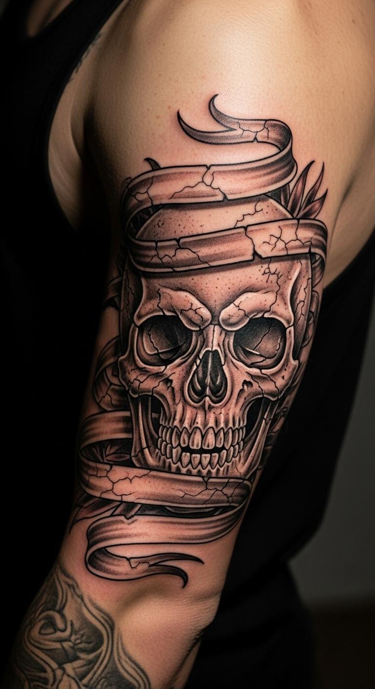 A skull and banner combo on your arm mixes edge with meaning, like a skull under a banner for memories. Imagine the bold lines telling a tale. Draw skulls at home with basic supplies—keeps expenses low. Look for walk-in deals for about $100. Place it where it fits your sleeve length. Easy actions: add banners yourself in sketches. Try henna versions to test. Healing involves avoiding sweat. This design stands out in social settings. Opt for simple inks. It’s a direct choice for statement-making.