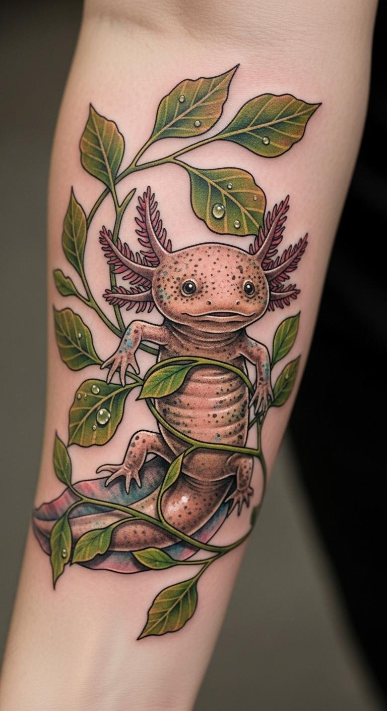 Add leaves to honor the axolotl’s endangered status. Foliage frames it thoughtfully. Place on your upper arm for meaning. This design raises awareness subtly. Trace leaves from nature books at home. No cost involved. Seek eco-focused artists with fair rates. Check community boards. Press real leaves for a template. It’s free. Bold the key: leaf details promote conservation. Opt for spots that are easy to protect.