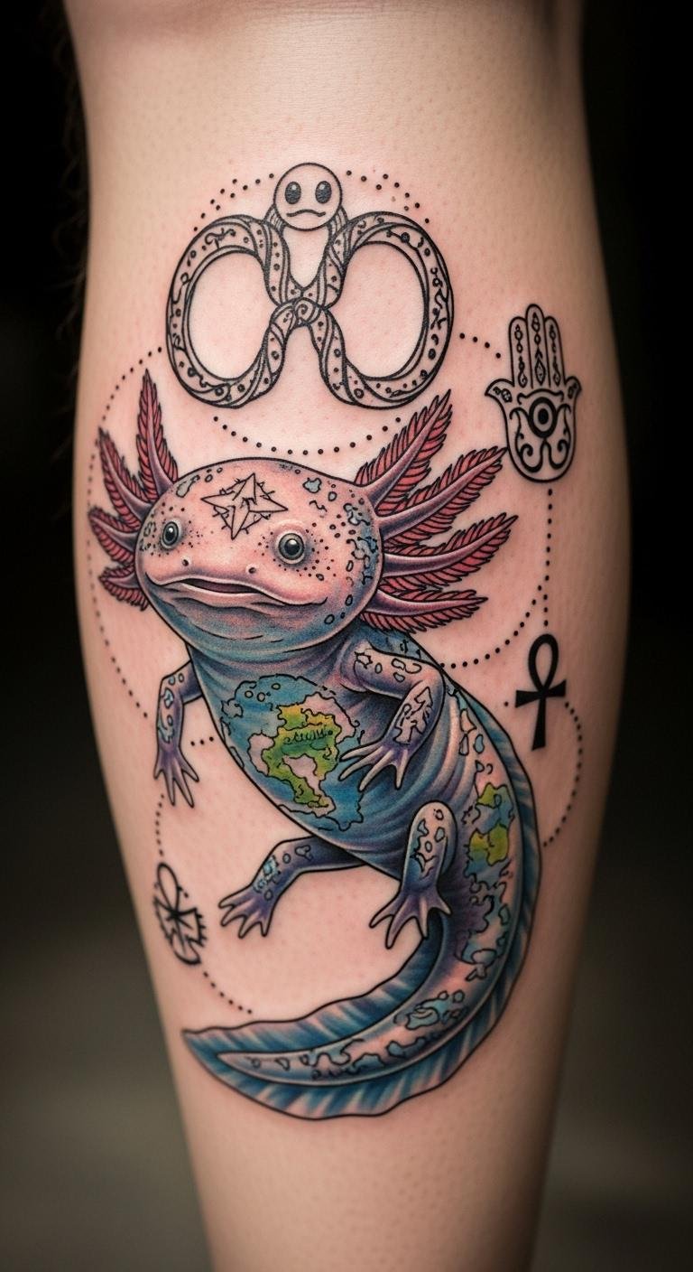 Incorporate nature like fire or waves. It ties to the axolotl’s world. Place on your leg for extension. This design connects. Draw elements around it freely. Home activity. Seek nature-themed artists with deals. Options online. Use natural items for mock-ups. Free stuff. Bold the key: nature elements deepen ties. Choose spots for visibility.
