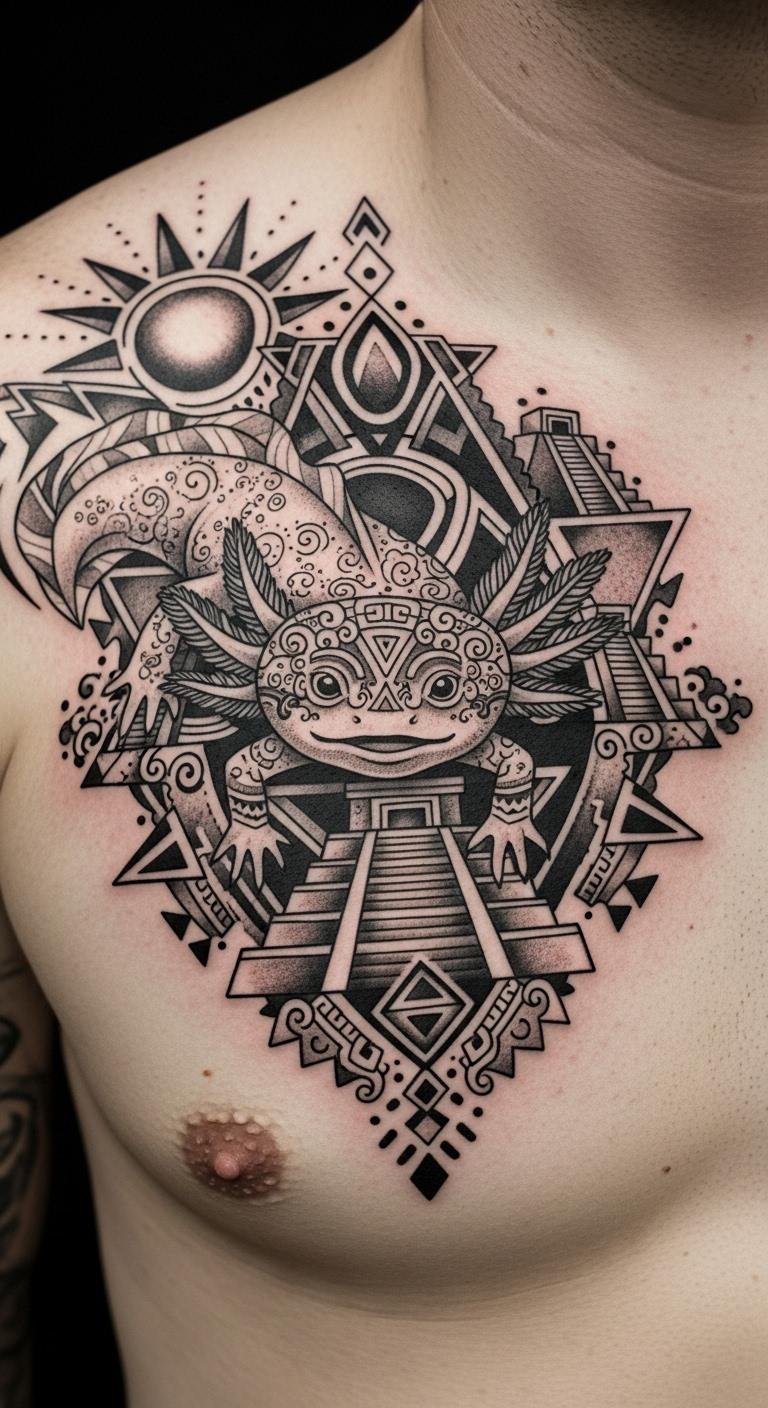Mix Aztec patterns with the axolotl for a heritage feel. Geometric shapes frame the animal nicely. Put it on your upper arm for visibility. This style honors roots with meaning. Use online templates to add patterns yourself. Print them for free to test ideas. Look for artists skilled in cultural designs at community events. They might offer lower rates. Create a paper cutout version at home for practice. Supplies run about $3. Bold the key: Aztec patterns add depth. Choose spots that are easy to cover for daily life.