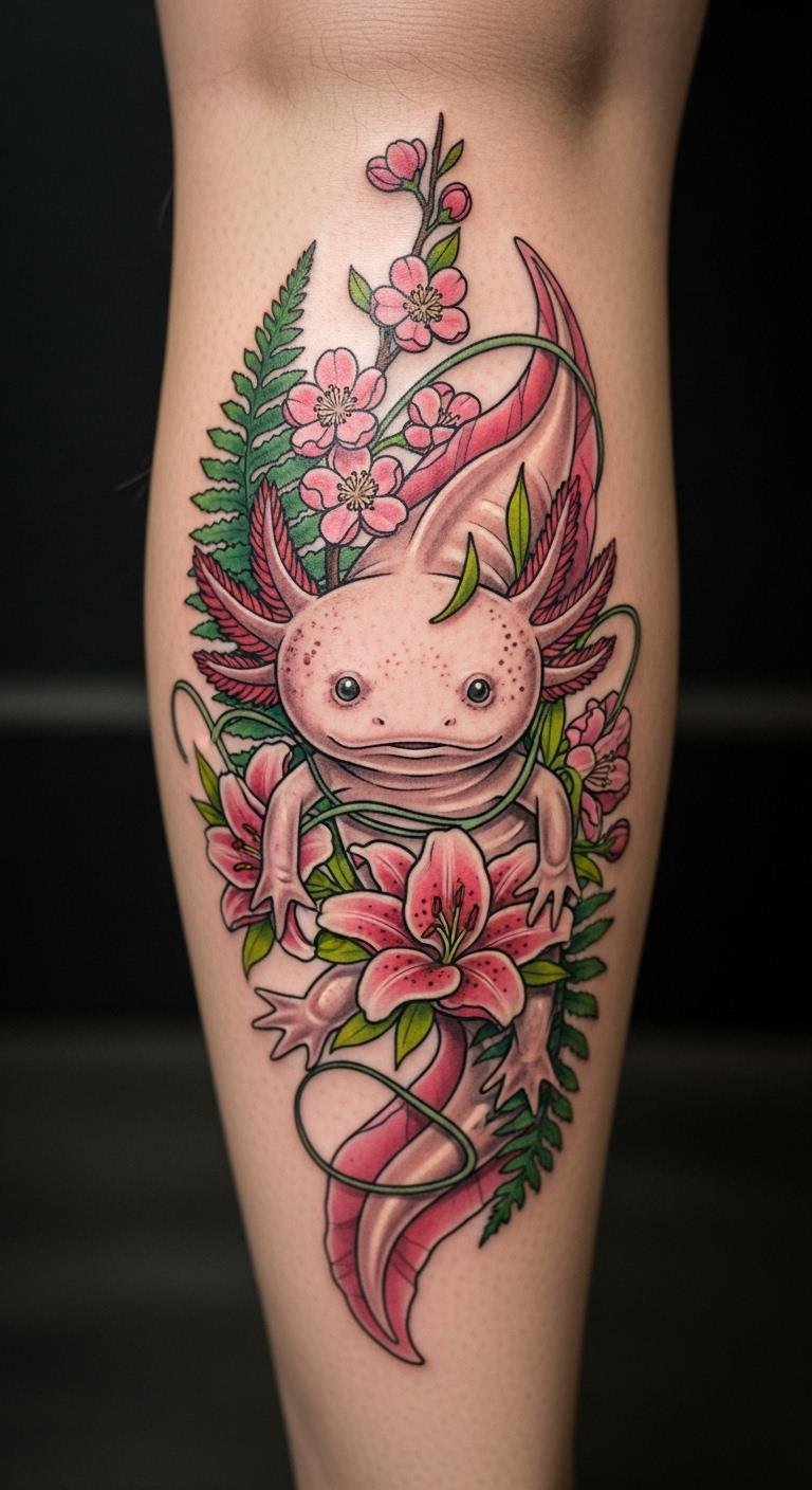 Surround the axolotl with flowers for added charm. Petals weave around its body seamlessly. Try this on your ankle for a delicate touch. It enhances the overall story. Sketch flowers around a simple axolotl on paper. Free drawing tools online speed this up. Find floral-specialist artists who charge by the hour. Look for deals online. Make a floral sticker design at home for testing. Stickers are cheap at $2. Bold the key: floral elements enrich symbolism. Keep the size small to keep costs down.