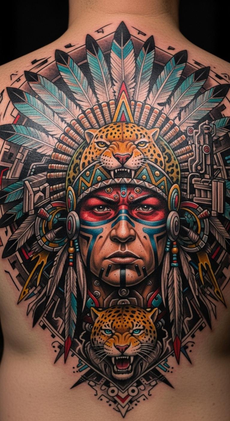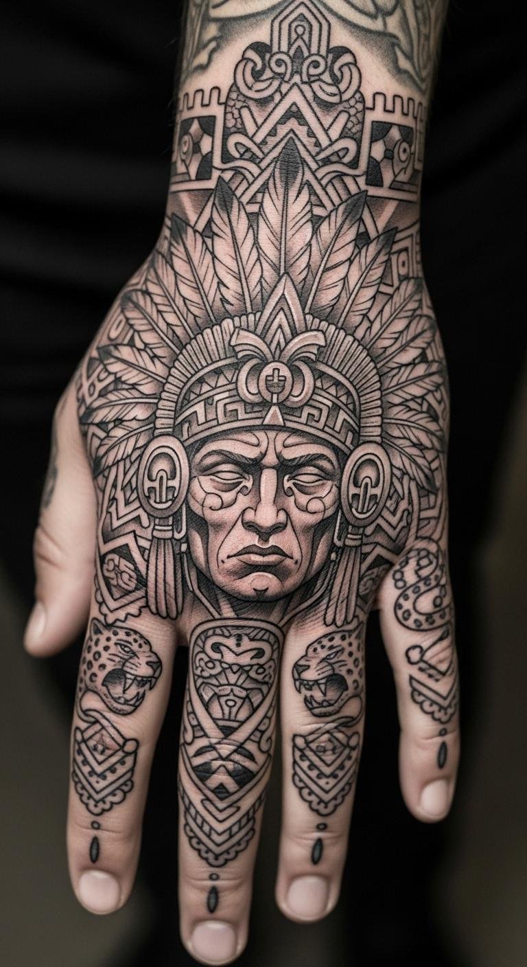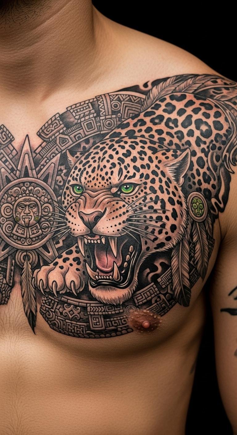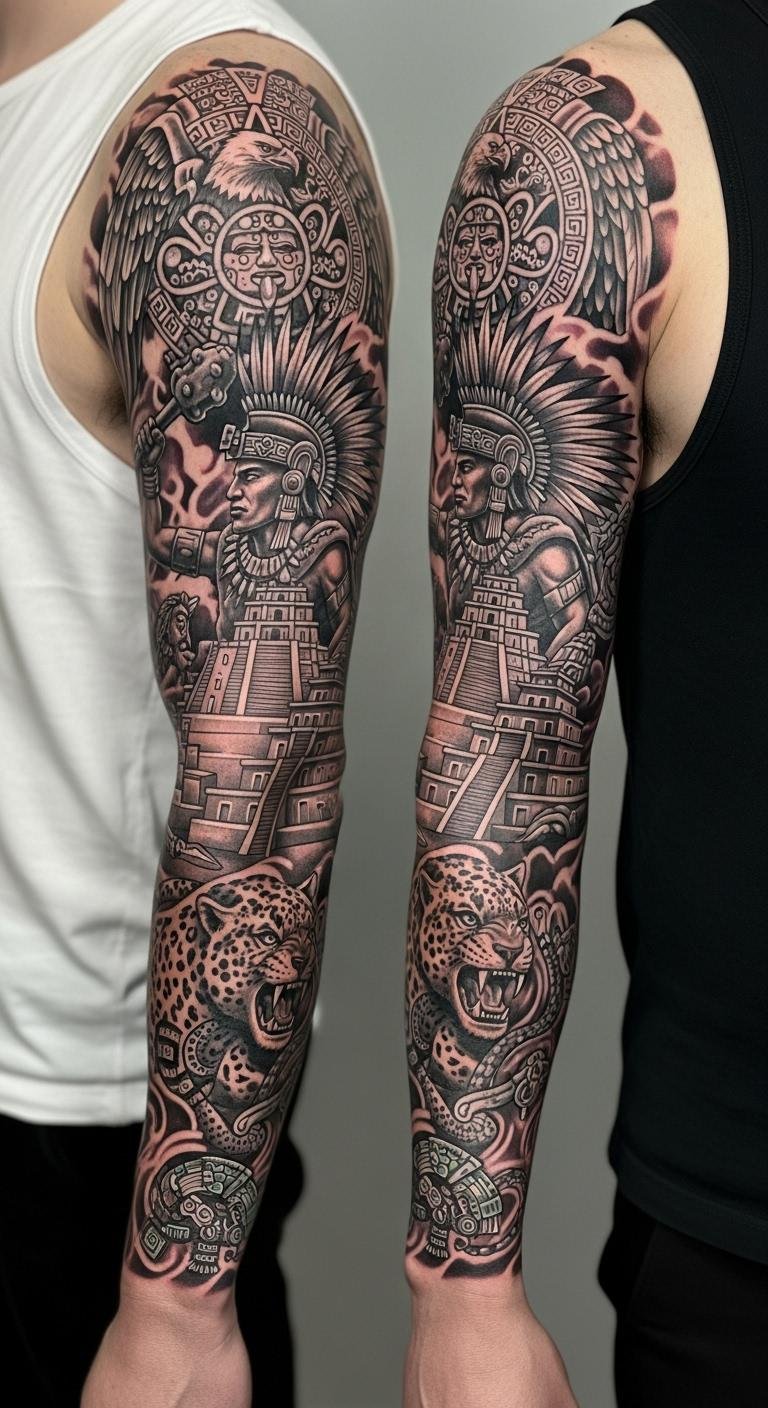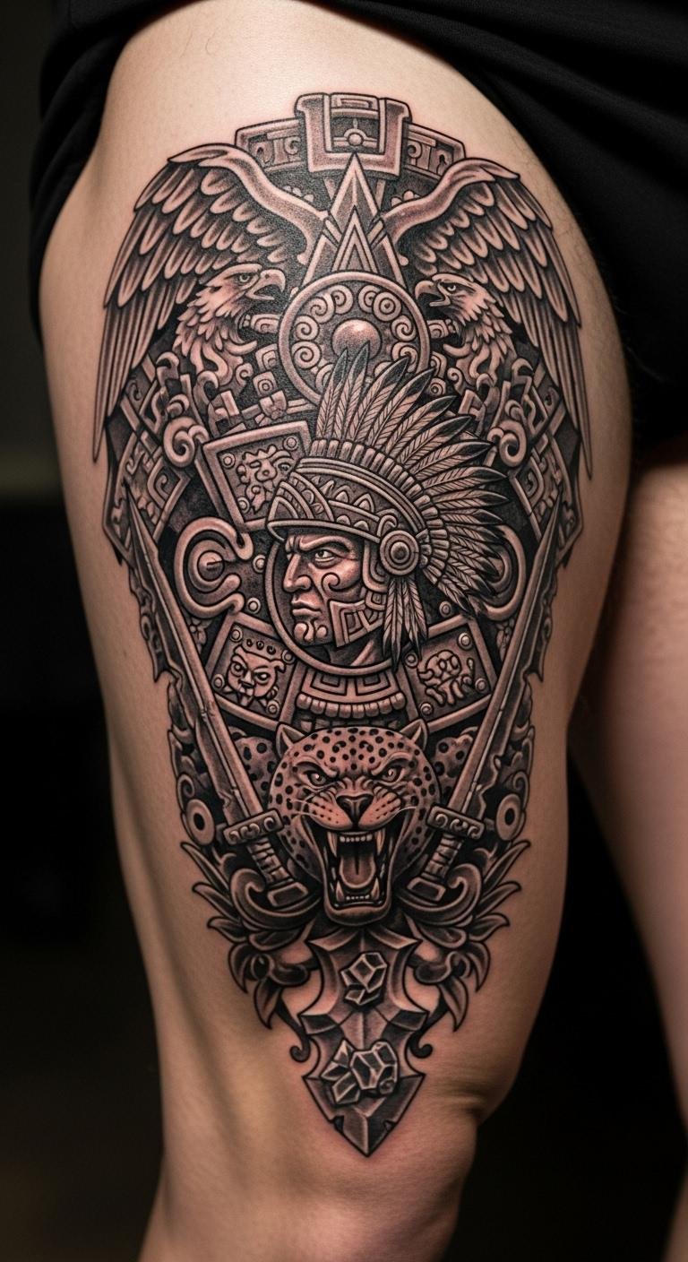 Imagine a jaguar pouncing in your tattoo, capturing courage and stealth from Aztec lore. This design mixes the cat’s spots with warrior elements for a dynamic vibe. Draw it out casually on paper with markers you already own, keeping details simple. Test with a henna kit from a craft store—costs less than ten dollars and washes off easy. Look for free online tutorials to tweak the layout yourself. Once decided, connect with nearby tattoo shops via social media for low-cost quotes. Add your own symbol, like a star, to make it unique without extra fees.