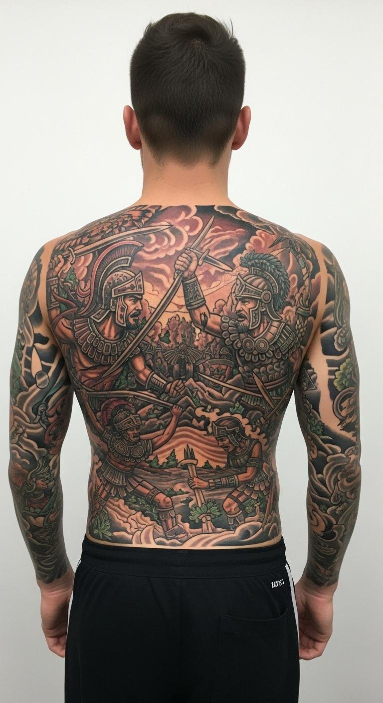 Go big with a back tattoo that spreads out a warrior scene, covering space with epic elements. This style tells a full story. Plan on paper with markers from home. Practice with large drawings on fabric scraps. Use phone apps to visualize for free. Find artists offering package deals online. Customize by adding a simple figure to make it your own.