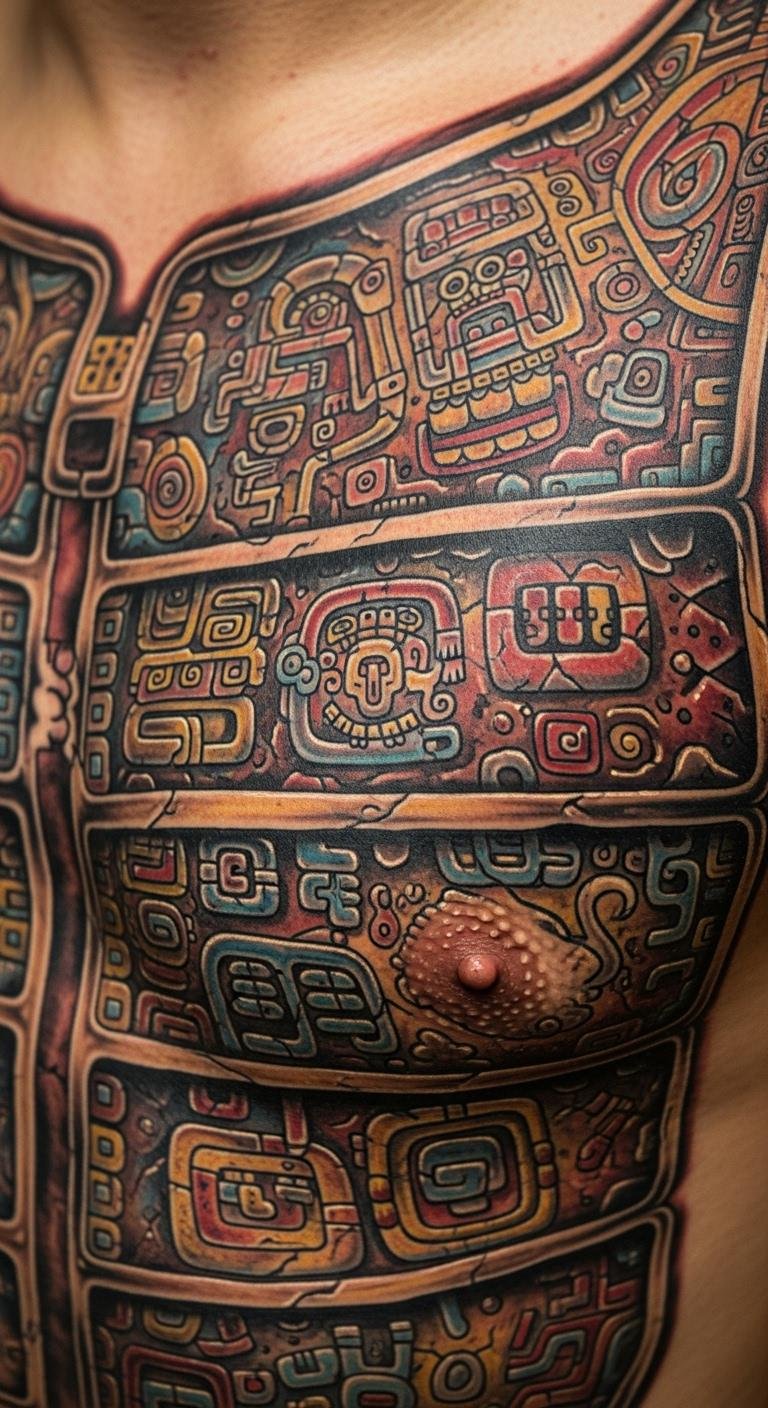 Cover your chest like ancient armor, using plate designs for a badge of honor. This warrior ink shows strength upfront. Sketch on a mirror with soap—easy and free. Try fabric patches to simulate. Edit designs with free online editors. Contact shops for beginner rates. Personalize with a quick addition, like a line.