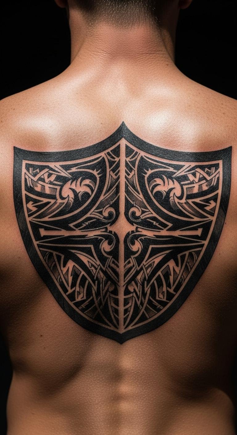A tribal warrior shield tattoo brings strength and heritage to your back. Picture bold lines forming a protective emblem that covers the upper back. This design tells a story of courage and roots. Start small with a sketch on paper to see how it flows. For a budget option, use temporary tattoos from online stores under $10 to test the look. Work with a local artist; bring photos of traditional patterns to adapt. Keep sessions short, around 2 hours, to manage cost. Bold patterns like this last for years with basic care. Add personal touches, like family symbols, for meaning. Choose black ink to keep it simple and affordable. This style fits under shirts for daily life. Go for it if you want something timeless.