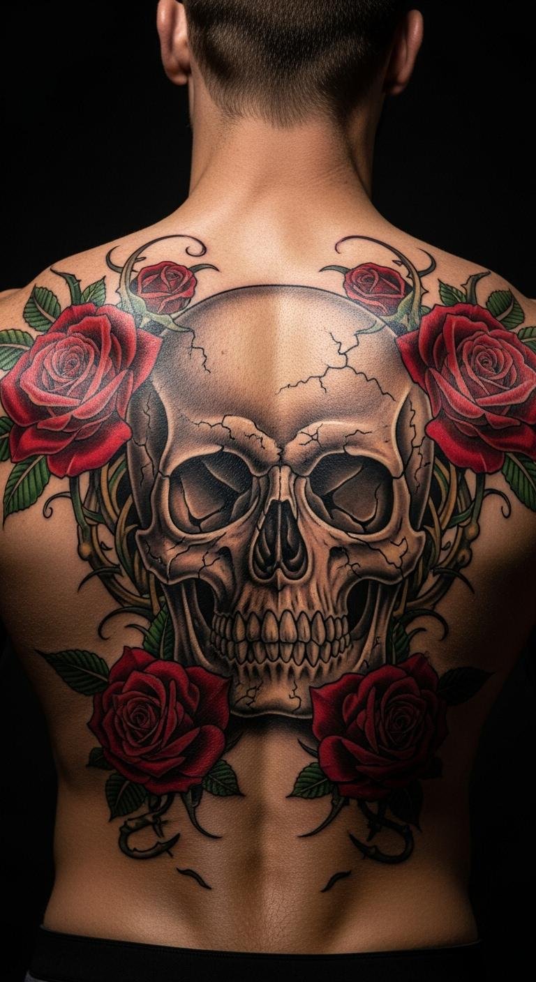 A skull and roses tattoo blends life and death on your back. Imagine a skull with roses blooming around it. This design mixes edgy and beautiful. Sketch it quickly. Test with cheap transfers. Work with detail artists. Keep visits short. Add personal roses. Bold skull pops. Use basic care. Suited for rebels. Try for contrast.