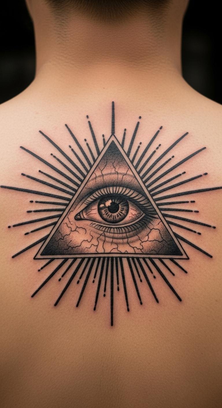 An eye of providence tattoo watches over you on your back. Think of an eye with rays for protection. This style offers insight. Draw it simply. Use temporary options. Share meanings with artists. Quick session. Personalize rays. Bold eye guards. Care routinely. Suited for guardians. Choose for watchfulness.