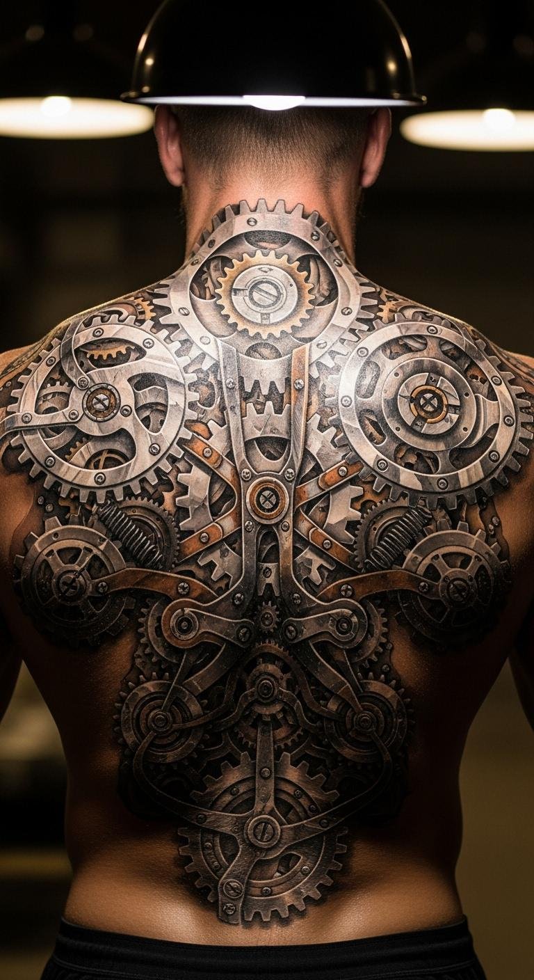 Mechanical gears tattoo revs up innovation on your back. Envision gears turning together. This design feels futuristic. Plan with drawings. Try with kits. Discuss mechanics with artists. A few hours. Add chains for fun. Bold gears work. Heal with ease. Good for inventors. Go for edge.