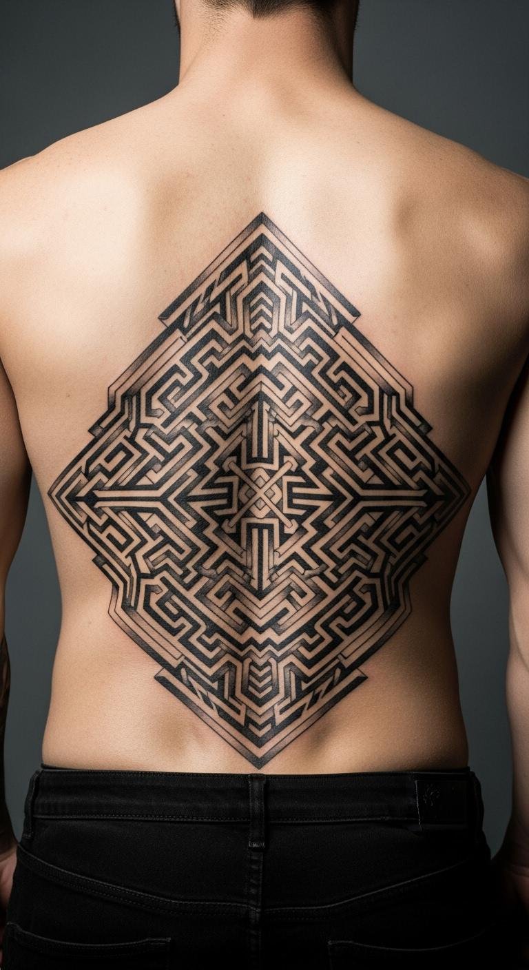 A geometric maze tattoo offers clean, modern vibes on your back. Think of sharp lines and shapes that create a puzzle-like effect. This style fits the middle of your back for balance. Sketch ideas on paper using a ruler for precision; it’s free and fun. Grab geometric stencils from dollar stores to experiment. Chat with artists about simple tweaks to save money. Sessions might take 3 hours total. Add dots or lines yourself in drawings to personalize. Bold shapes stand out with minimal ink. Protect it from sun with cheap sunscreen. Ideal for tech lovers. Go for this if you like abstract art.