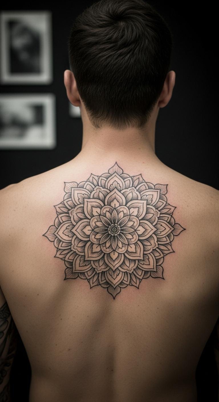 A floral mandala tattoo blooms peace on your back. Picture flowers in a circle for harmony. This style calms the mind. Color with crayons first. Use transfers cheaply. Talk symmetry with artists. One visit. Customize petals. Bold mandala centers. Protect from elements. Ideal for meditators. Pick for serenity.