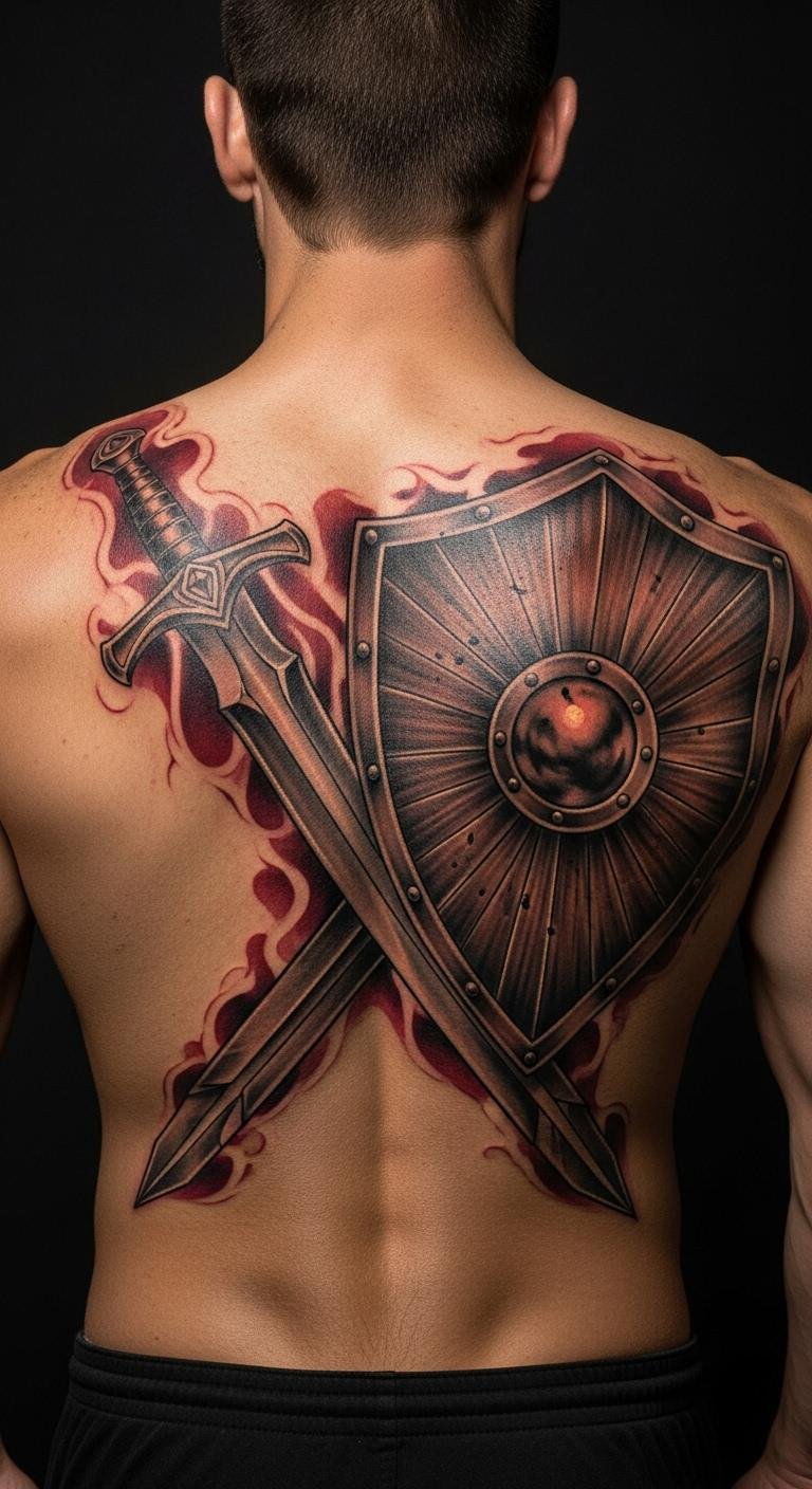 A sword and shield tattoo defends your story on your back. Envision crossed items for protection. This style builds resilience. Draw weapons quickly. Use affordable mocks. Discuss defense with artists. Keep it brief. Personalize hilts. Bold steel shines. Heal step by step. Good for fighters. Choose for guard.