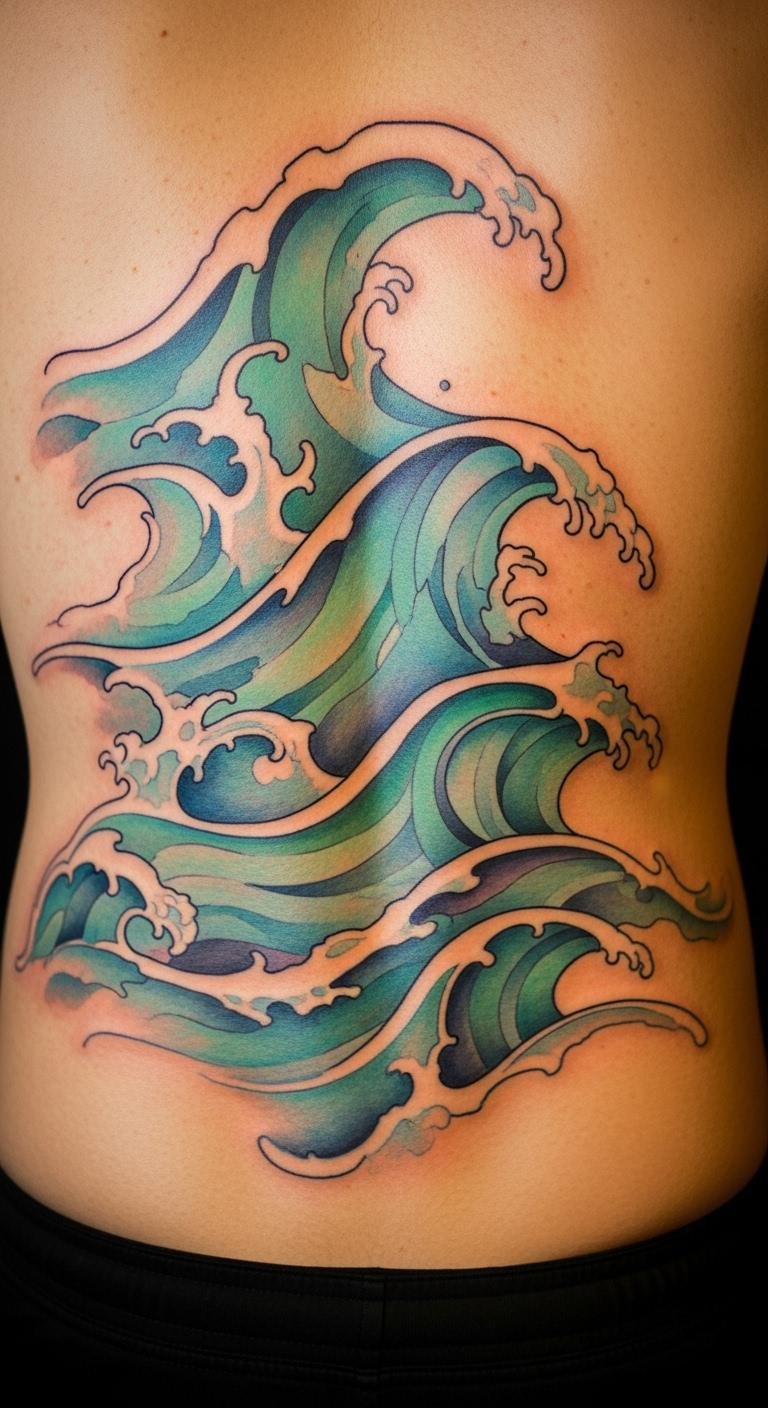 An abstract watercolor waves tattoo adds an artistic touch to your back. Think of soft, blended colors mimicking ocean movement. Place it along the sides for flow. Experiment with watercolors on paper at home. Buy wash-off tattoos online for under $10. Talk styles with your artist over messages. Keep sessions light. Mix in personal colors for flair. Bold waves create movement. Protect from water initially. Ideal for creatives. Choose this for a unique look.