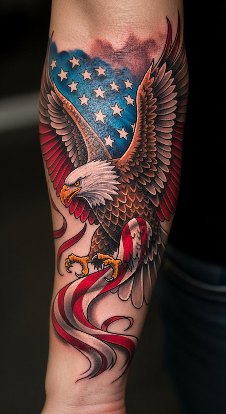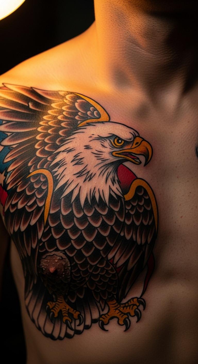 A traditional bald eagle tattoo on the chest says you’re proud and strong. Think big, bold lines that pop. This spot shows off your ink every day. Start with a simple sketch at home using a pen and paper. Draw the eagle’s head and wings first. Pick a local artist who uses basic tools. Keep costs low by choosing black ink only. For care, clean the area with soap and water twice a day. Add a personal touch by including a small date under the wing. Many folks pair this with family symbols for meaning. Try a budget app to find affordable artists nearby. Wear loose clothes while it heals to avoid irritation. This design fits active people who want to feel empowered. Grab a mirror and trace ideas on your skin before deciding. Simple steps like these help you own the process.