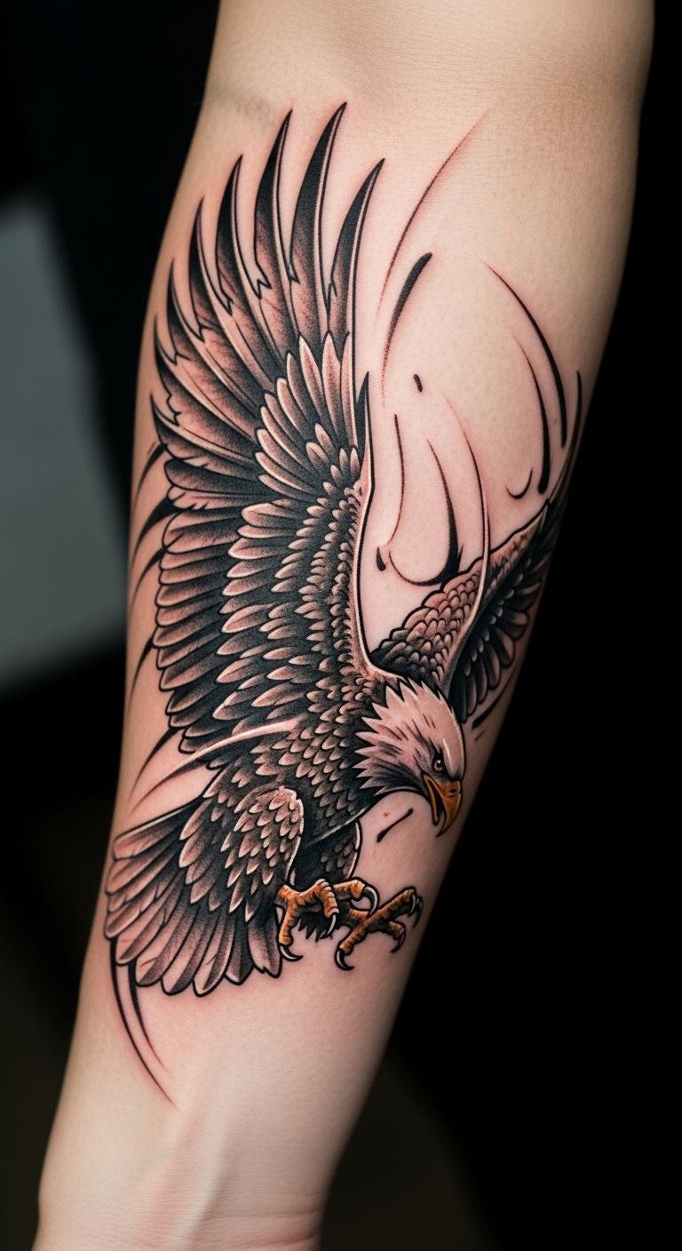 A forearm eagle in flight shows movement. Keep it flowing on your arm. Use flowing pens for home ideas. Grab flight designs online at no cost. Go with motion lines for budget. Protect during activities. Add wing extensions for speed. Many get this for freedom themes. Use action videos for reference. Place it where it inspires. This idea fits dynamic lives. Trace on moving paper. Simple motions help plan.