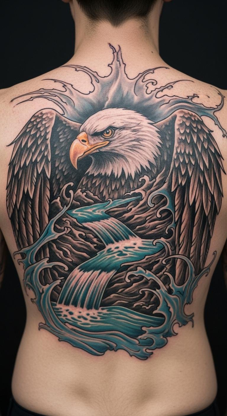 A back eagle with river flows evokes journeys. Spread it across your back. Draw rivers with blue pens. Get flow templates online. Use water effects cheaply. Protect from sweat. Include stream paths. Folks choose for paths. Try water apps. Place for expanse. This works for travelers. Trace on maps. Easy flows inspire.