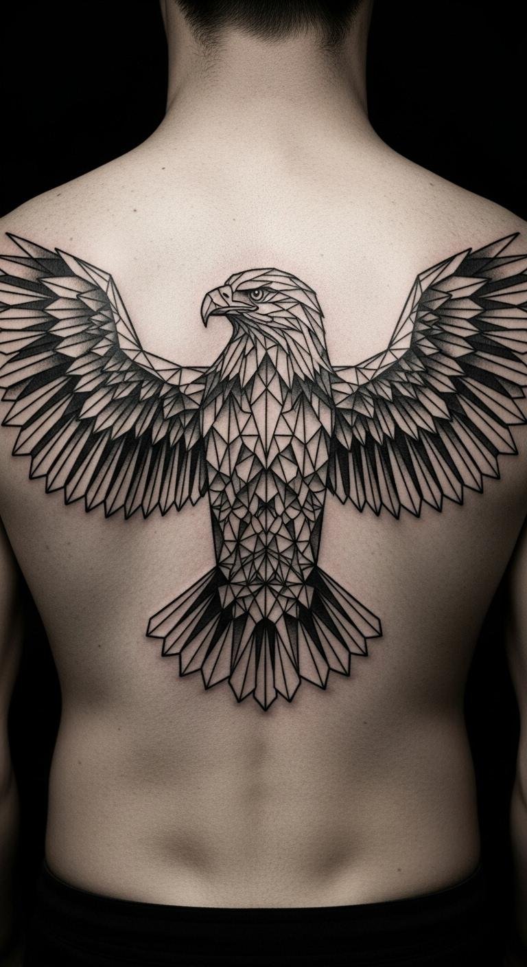 A geometric eagle tattoo mixes shapes for a cool update. Put it on your back for a large canvas. Use a ruler and paper to draw triangles and lines at home. Look for free geometric guides online. Stick to basic ink for affordability. After, protect with old shirts. Add angled wings to make it stand out. People pick this for its modern twist. Try phone filters to preview on your body. Select spots that allow movement. This idea appeals to those who like clean designs. Practice on notebook paper for accuracy. Simple tools make it approachable and fun.