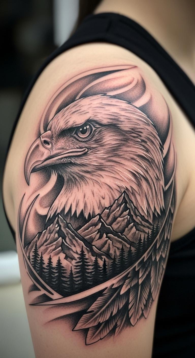 An eagle with mountain elements adds a nature theme. Place it on your shoulder for balance. Draw hills and birds with crayons first. Grab free nature templates online. Opt for simple inks to stay affordable. Use soap from your kitchen for care. Include peak shapes behind the wings. People like this for adventure vibes. Experiment with apps for free previews. Choose spots that flex with you. This idea suits outdoor enthusiasts. Sketch on cardstock to visualize. Easy tweaks keep it fresh.