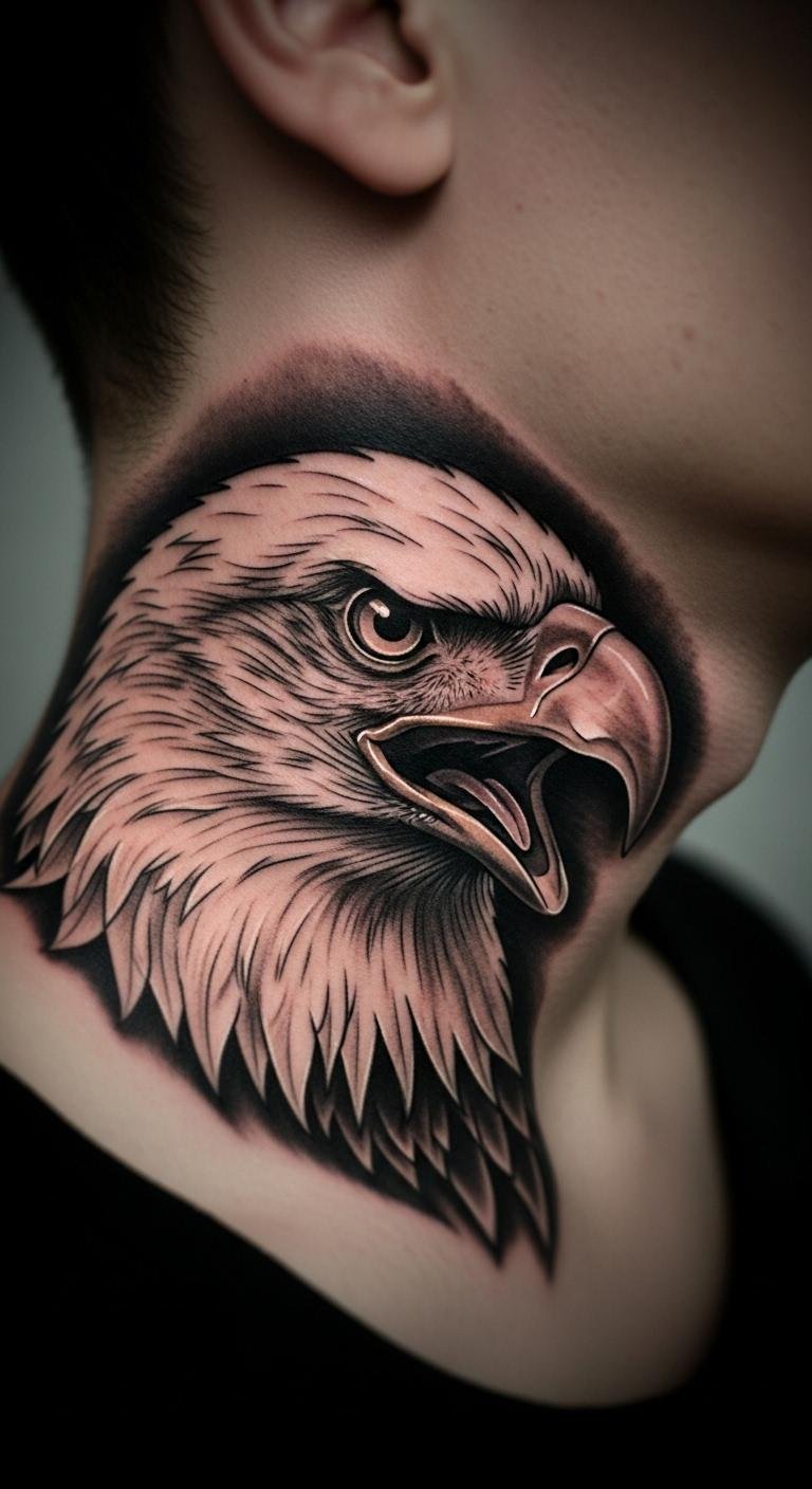A bold eagle on the neck makes a statement. Position it for symmetry. Start with bold markers for home planning. Look up bold designs for free. Select dark inks to save money. Cover with scarfs during healing. Include beak details for edge. Folks go for this to show attitude. Use phone cameras for quick checks. Choose areas that align with your style. This design appeals to confident individuals. Practice on paper for precision. Quick steps help you commit.