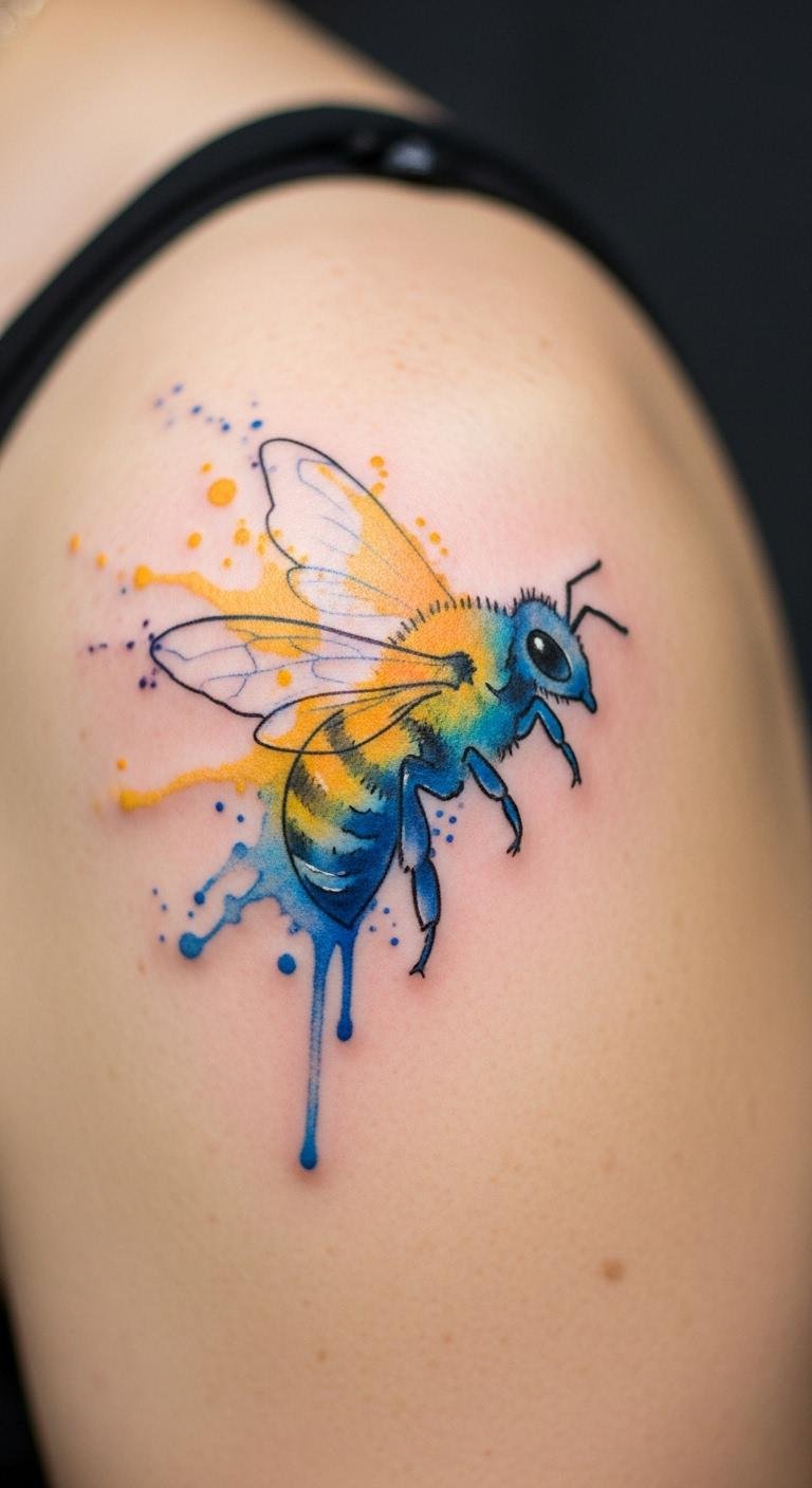 Go for a watercolor bee tattoo if you like artistic flair. It uses soft colors that blend like paint. This design mimics water’s flow for a dreamy look. Grab colored pencils and practice on paper first. Free tools online let you mix hues digitally. Place it on your arm for visibility. Save money by choosing smaller sizes. Add flowers around the bee for extra charm. Real DIY idea: Use a phone app to layer colors over a bee sketch. Aim for sizes that fit your budget, starting at $50. Keep it fresh with sun protection. This style pops in photos and tells a story of nature’s beauty.