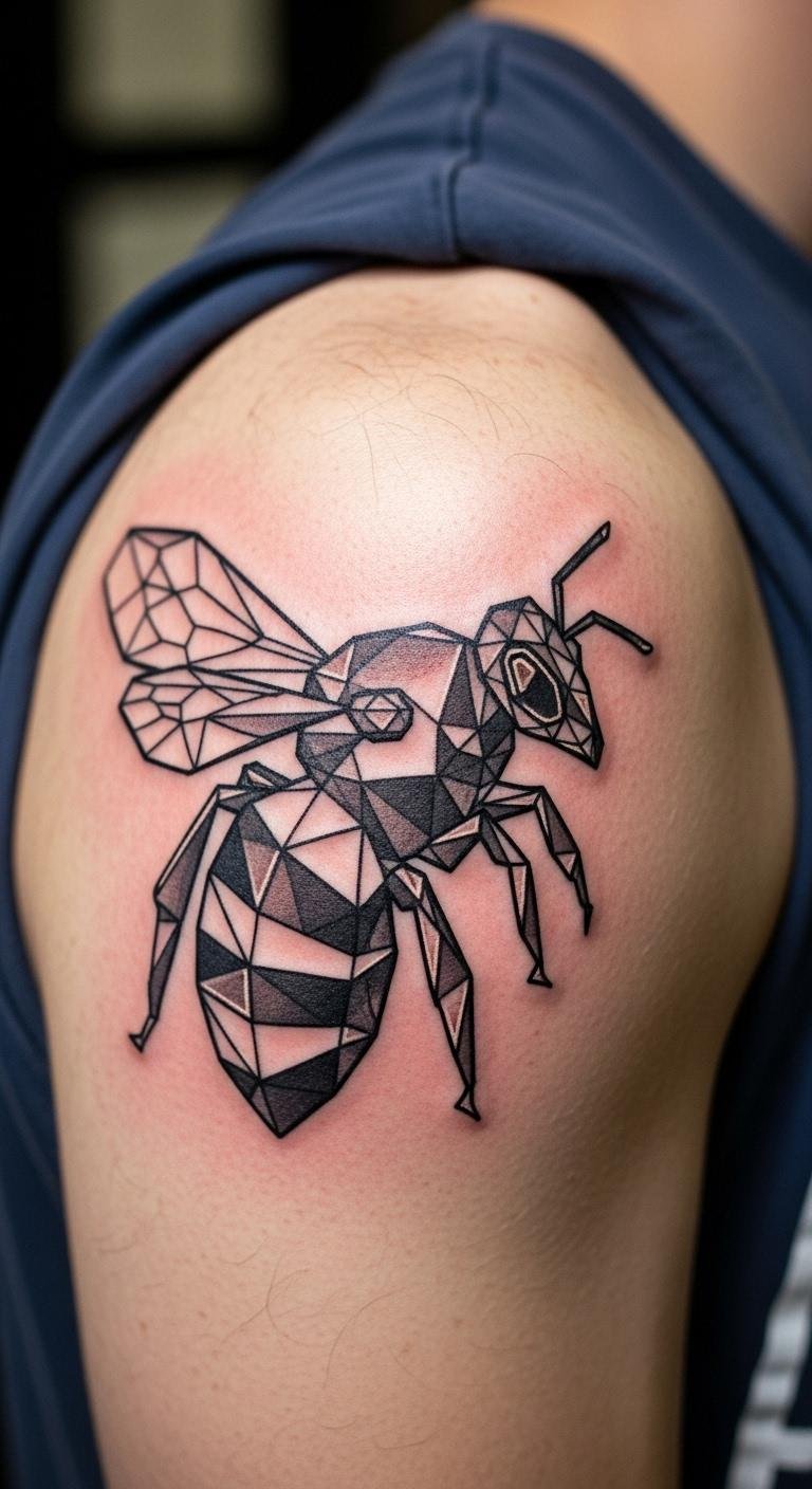 Geometric bees use shapes for a modern twist. Triangles and circles form the bee’s body. Sketch geometric grids at home. Apps with shape tools help build it. Place on your back for symmetry. Go for outlines to save. Personalize with extra angles. DIY idea: Layer shapes on your phone. Real tip: Test with stencils. This style is trendy and cost-effective.