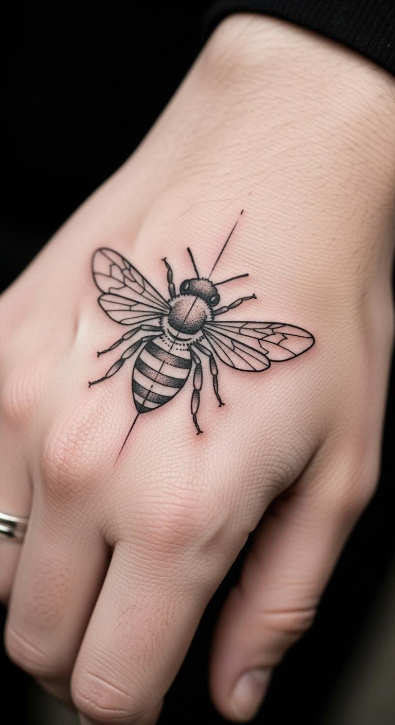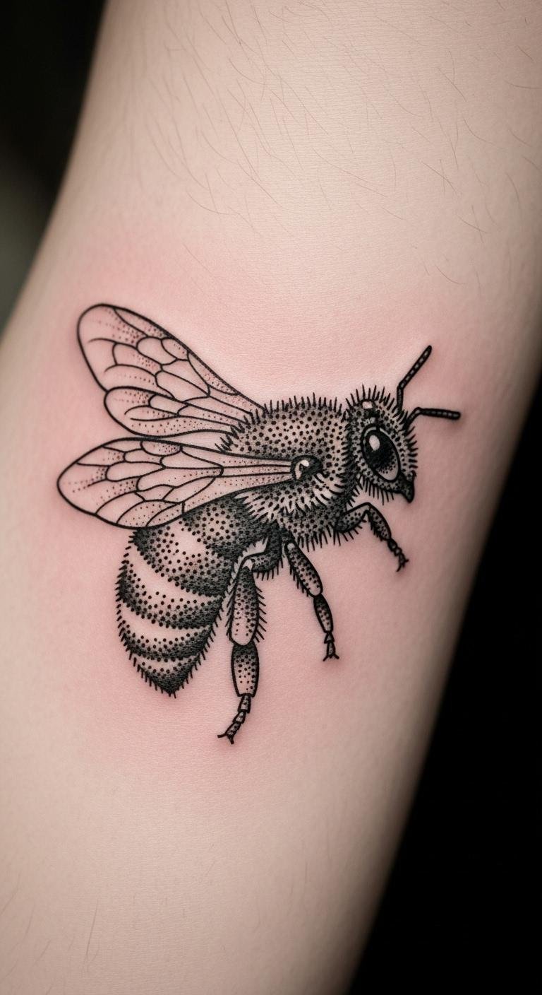 Dotwork creates bees with tiny dots for texture. It’s detailed yet understated. Practice dot patterns on paper. Free dot apps assist in design. Try your forearm for visibility. Opt for fewer dots to lower price. Add shading for depth. Budget hack: Use at-home dot makers. Real example: Build from online dot tutorials. This technique adds character affordably.