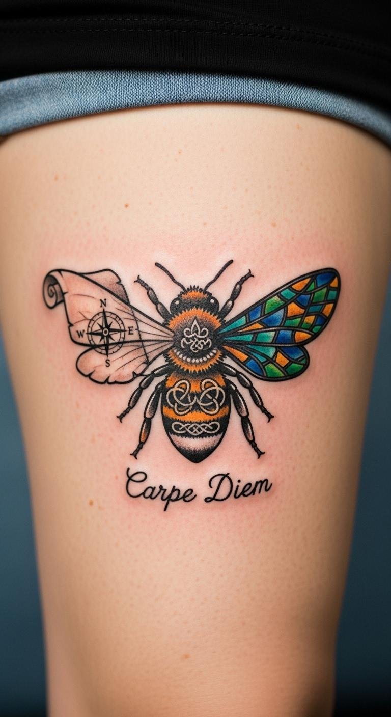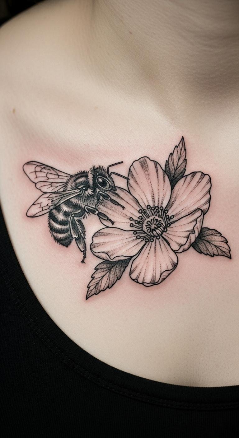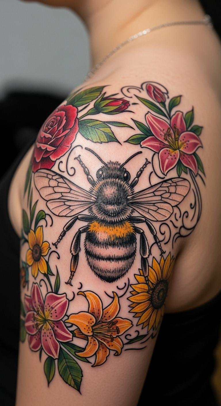 Bee Tattoo with Floral Elements