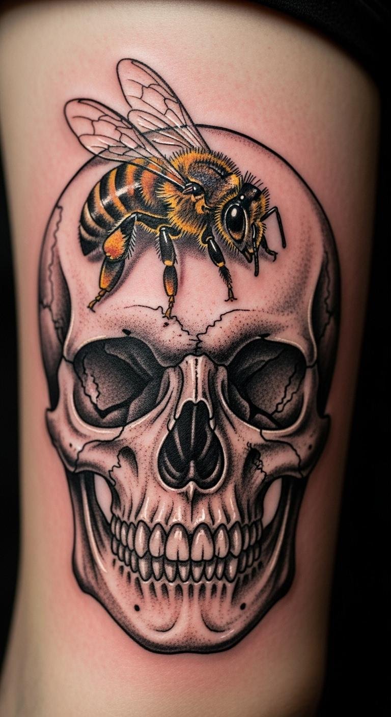 Bee and skull tattoos mix life and death themes. The bee sits on the skull for contrast. Draw both elements together. Apps help blend designs. Try your arm for boldness. Go black and white to save. Add details like eyes. DIY example: Overlay sketches digitally. Real tip: Practice the merge. This combo is striking and affordable.