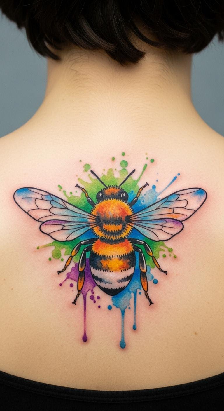 Vibrant watercolors make bees pop with color. Blues and yellows blend smoothly. Test colors at home. Apps for blending are free. Try your back for space. Opt for medium sizes. Add gradient effects. Budget advice: Use fewer colors. Real DIY: Experiment on paper. This style brings joy affordably.