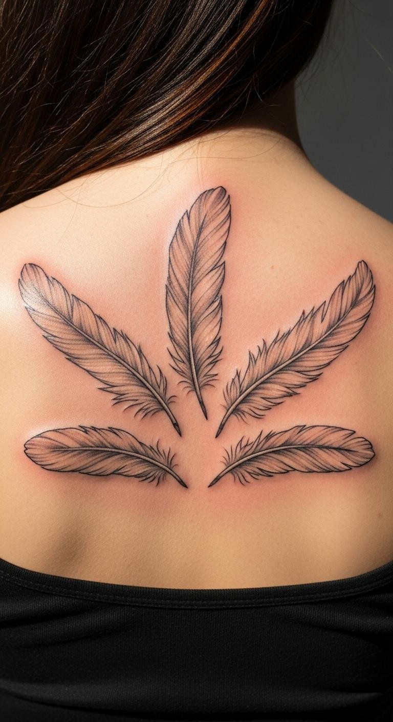 Feathers on the back represent freedom and grace. Select inks for light, airy looks. Trace real feathers for ideas. Get one for $140. Practice with feather pens at home. Pat dry after showers. This design lifts your spirit and assurance. Customize sizes easily. Budget balms protect the work.