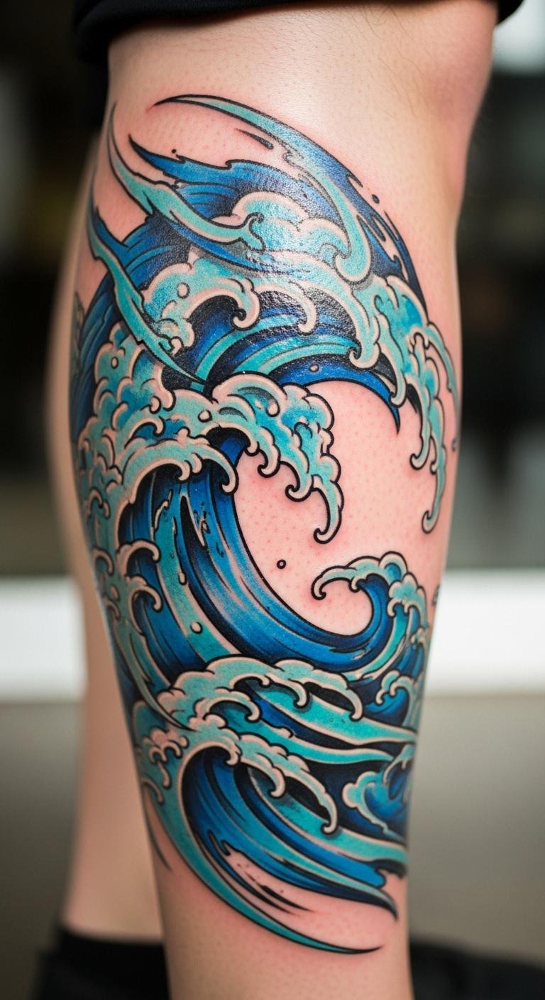 Waves on the calf show movement and calm. Use inks that capture fluid lines. Watch ocean videos for concepts. Spend $100 at a fair. Sketch waves on legs with markers. Keep the spot elevated. These tattoos bring peace and confidence waves. Add fish for extra flair. Inexpensive gels maintain vibrancy.
