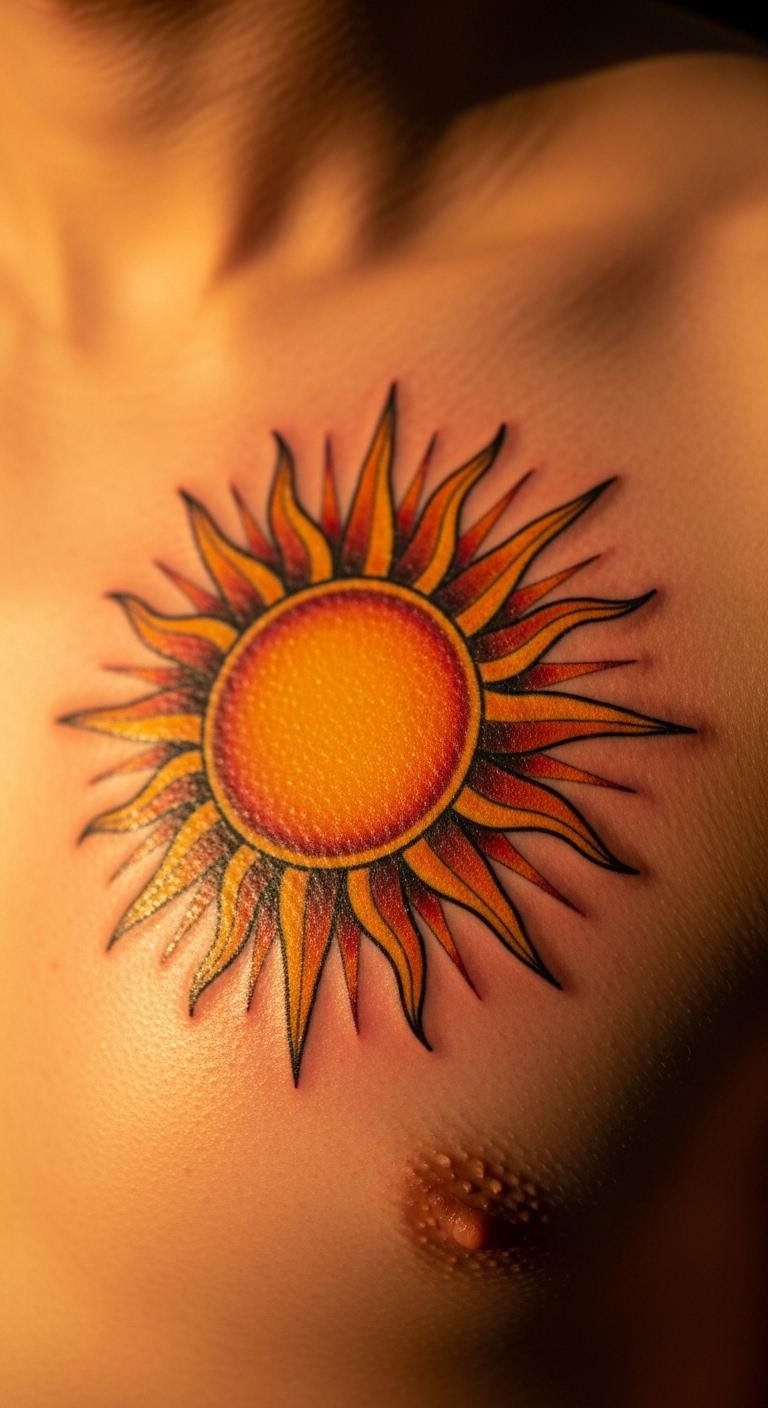 Sun on the chest brings light and energy. Use inks that glow with warmth. Draw suns from daily views. Aim for $130. Paint suns on walls at home. Expose to air for recovery. This design warms your confidence daily. Customize with details. Simple creams keep it shining.