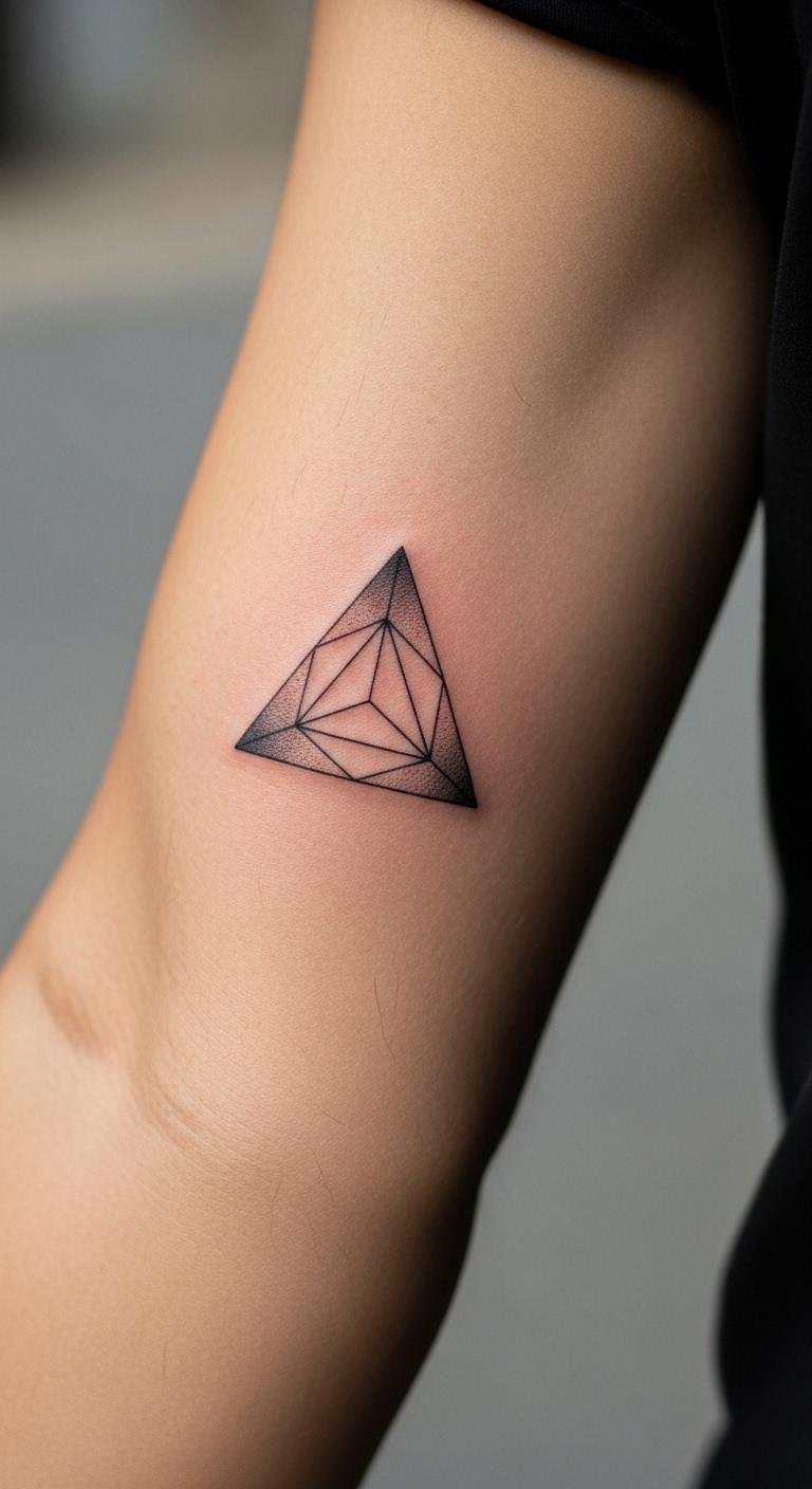 A simple geometric triangle offers a clean, modern vibe. This design uses straight lines to create balance. Pick a spot like your wrist for easy visibility. Start by sketching the shape on paper to test ideas. Use free online tools to draw your own version before hitting a studio. Budget tip: Local artists often charge less for basic shapes, around $50-$100. Try temporary tattoos first to see how it feels. This triangle can mean stability or growth. Keep it small, under 2 inches, for a professional edge. Pair it with daily outfits for added flair. Focus on black ink for longevity. Get one that matches your style quickly.