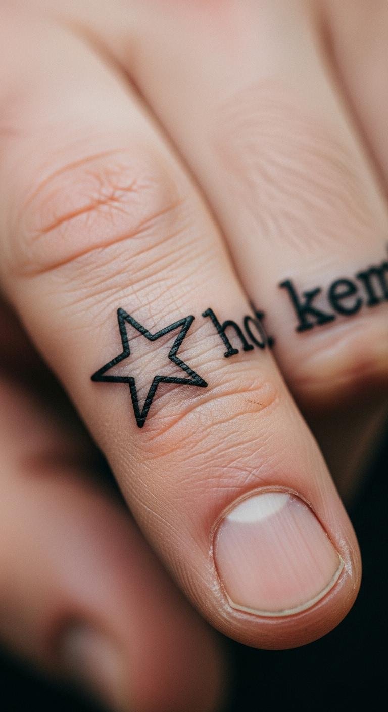 Pair a star with a word for meaning. Place it on your finger. Draw stars and words together. Use free editors. Budget tip: Combined tattoos save money, around $50. This adds layers. Stars and words enhance. Ink it and connect.