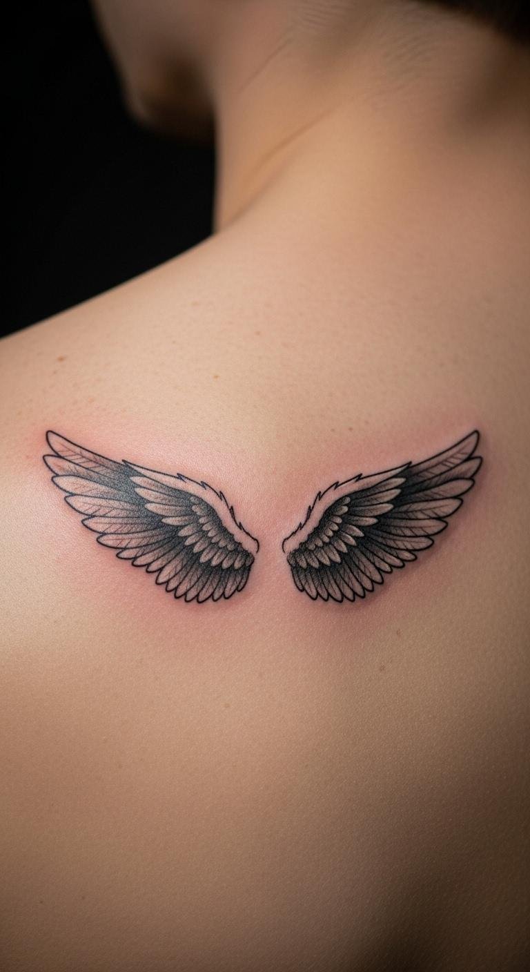 Angel wings mean safety and strength. Use fine lines for a delicate feel. Spot it on your upper back for discretion. Sketch wings at home for practice. Add simple feathers to personalize. Budget idea: Choose black and gray ink to cut costs, around $70. This design fits under clothes for work. Think about protection in your life as you plan. Keep it compact for impact. Get it and feel more confident daily.