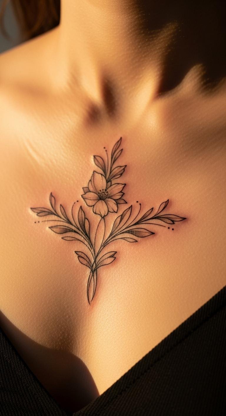 Think about a small floral tattoo. It adds a pretty touch to your chest. Flowers like roses or lilies work great. They follow the body’s curves. Start by sketching ideas on paper. Use free apps to draw simple versions. This helps you plan without spending much. Talk to a local artist for advice. They can adjust the size for your skin. Keep it small to ease any discomfort. Add soft colors if you like. This design feels feminine and easy to hide. Try it with everyday clothes. You might wear a low-cut top to show it off. Focus on what you love about flowers. They represent growth or beauty. Get one that matches your story. It’s a simple way to feel good about your choice.
