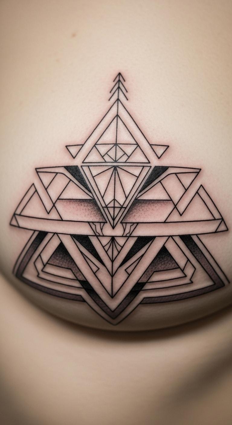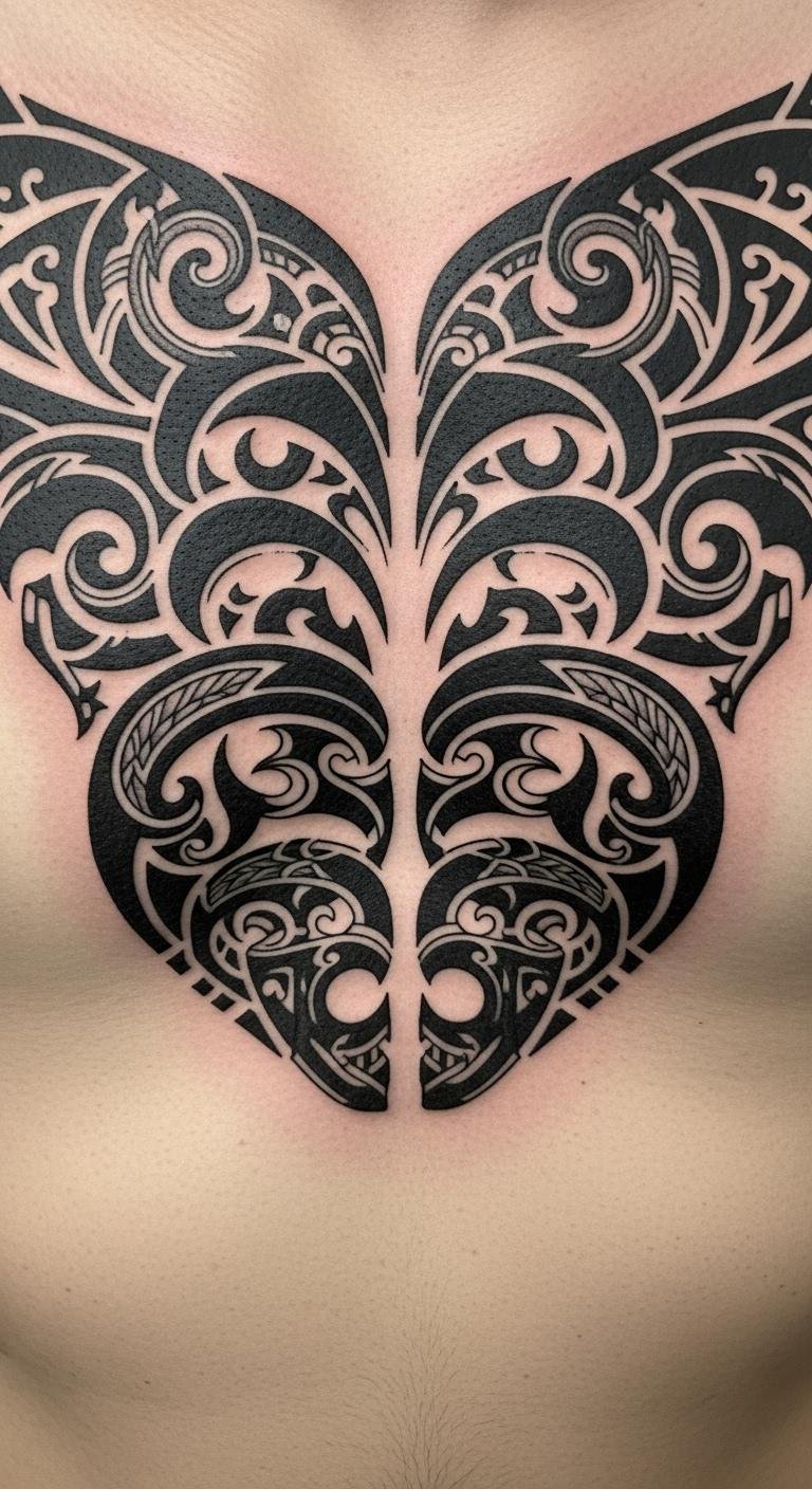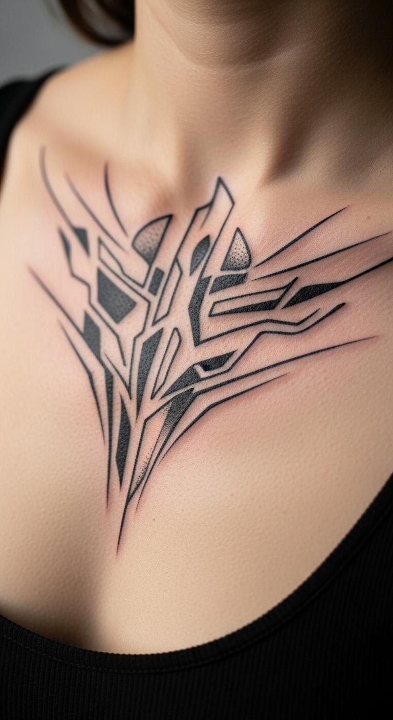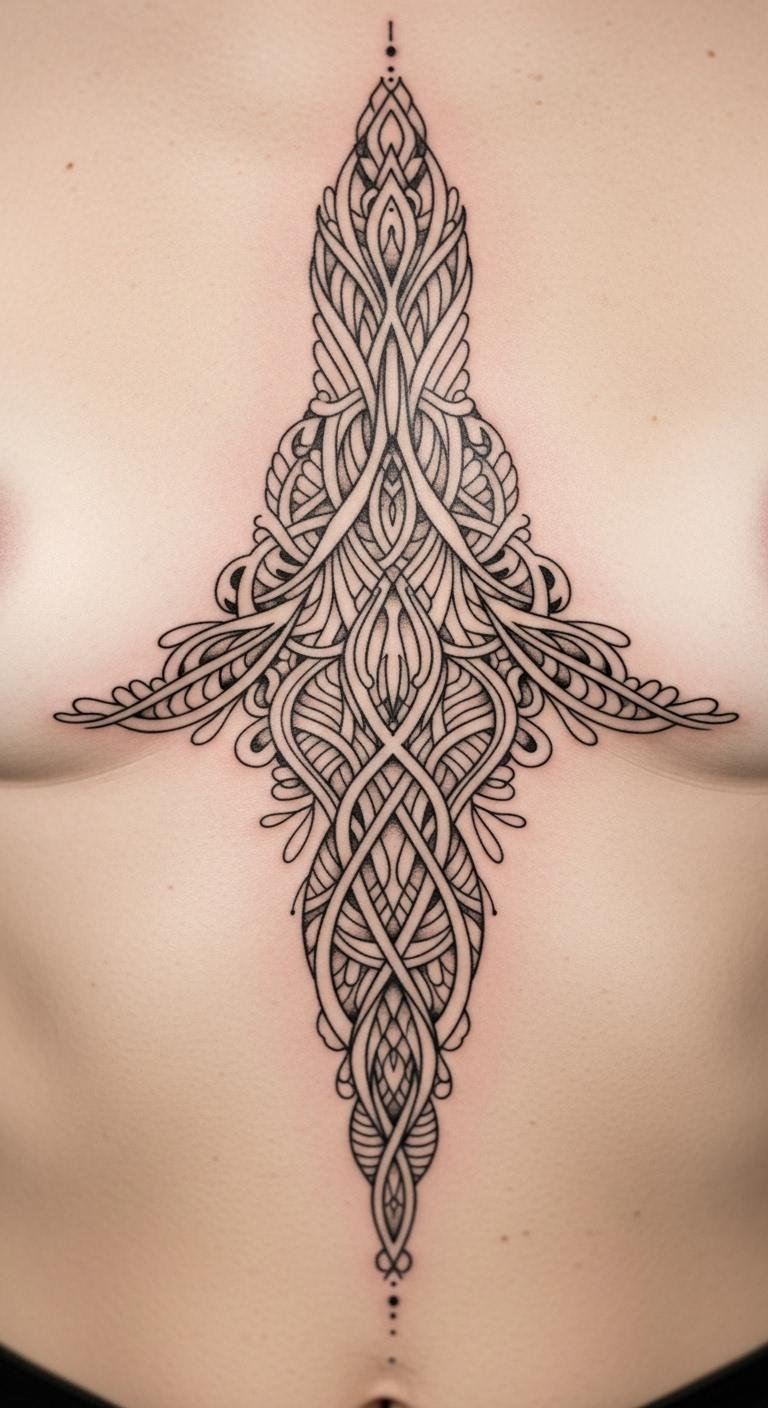 Geometric patterns offer a modern vibe. Triangles or lines can fill the space nicely. They look clean and precise. Try drawing shapes on your body with a marker. Use free apps to mix patterns quickly. This helps you see what works best. Ask a local tattoo pro for input. They might suggest basic tools for testing. Stick to simple black designs to stay budget-friendly. Arrange them vertically along your sternum. Cover with a regular top for professional settings. Let it peek out with casual wear. These patterns often stand for strength or unity. Select one that resonates with you. It’s an easy way to update your style.