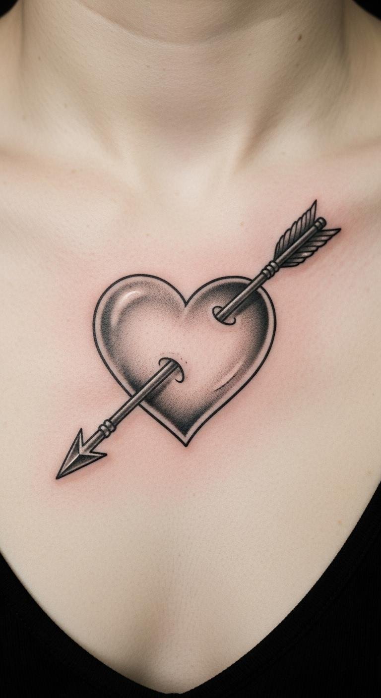 An arrow through heart adds edge. It fits snugly. Bold yet personal. Sketch hearts and arrows. Free tools help. This saves money. Get artist feedback. They perfect the look. Stick to basics. Place in the center. Cover for work. Uncover for fun. It means passion. Choose your style. It’s a striking option.