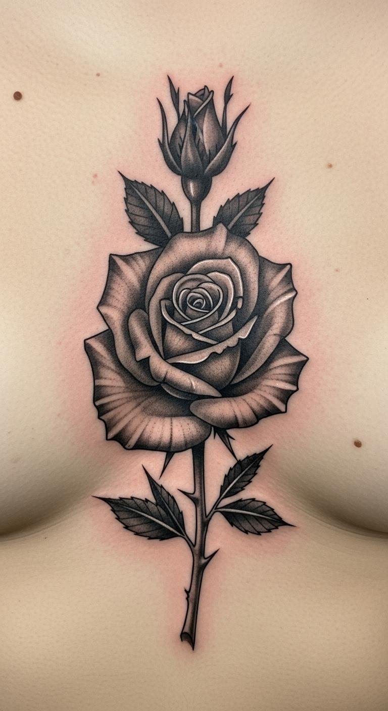 Black and gray roses offer timeless appeal. They fit the sternum without overwhelming it. The shading adds depth. Practice with gray-scale drawings at home. Free apps provide rose templates. This keeps things affordable. Discuss with an artist for refinements. They use standard methods for comfort. Stick to black ink for lower costs. Place it centrally for balance. Conceal with a basic top. Unveil in social settings. Roses stand for beauty or passion. Pick your favorite style. It’s an effective choice for expression.