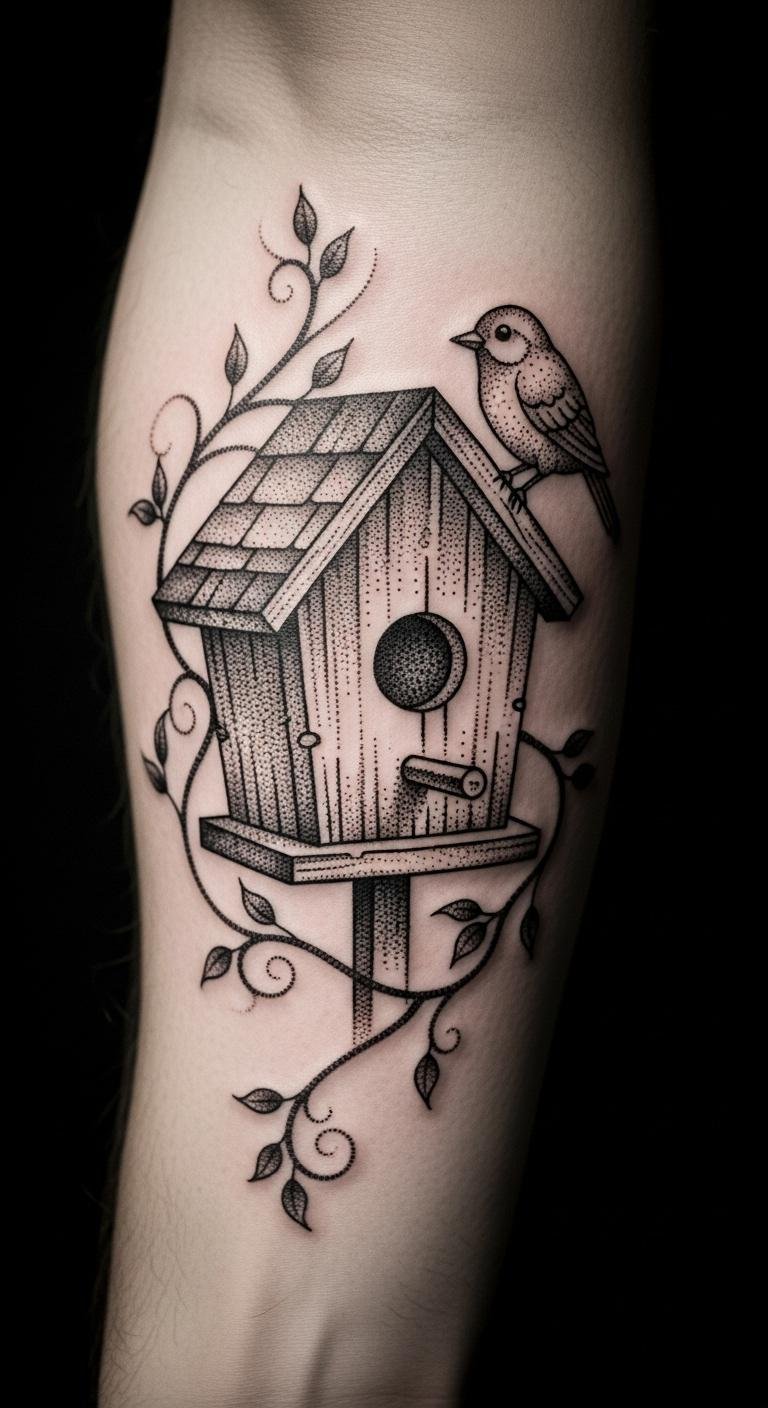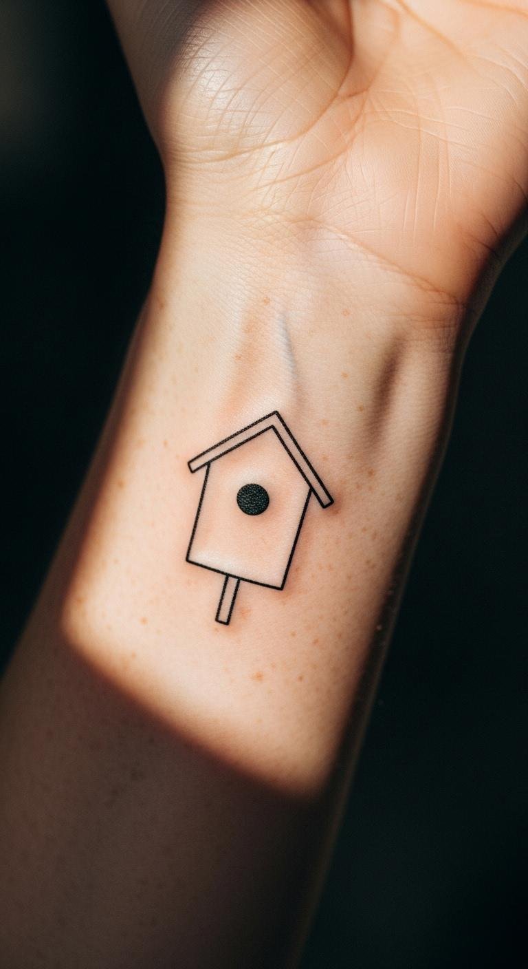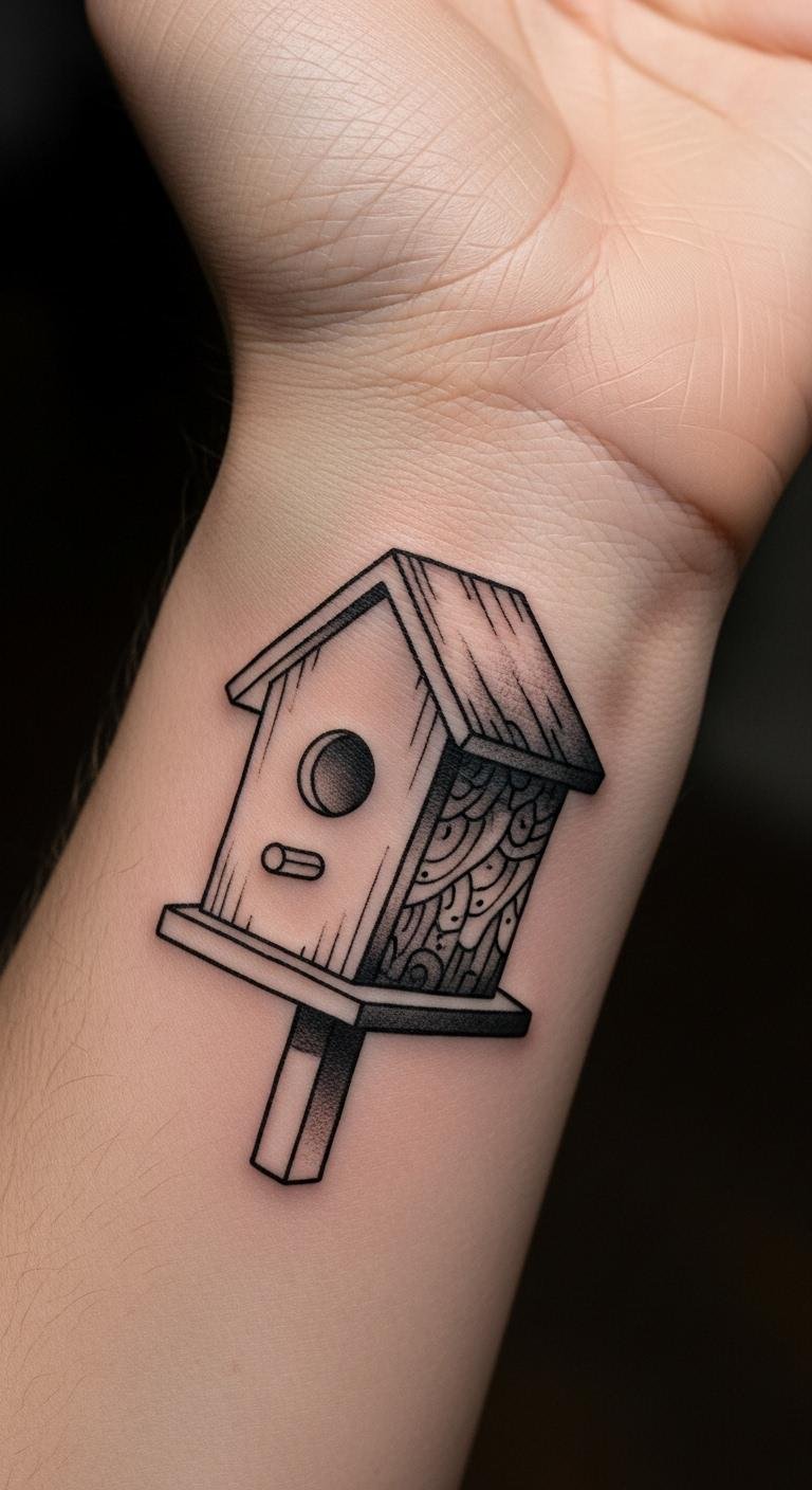A minimalist birdhouse tattoo keeps things straightforward. Think one small house shape with basic lines. This design fits on your wrist for easy daily view. Start by sketching ideas on paper. Use free apps like a drawing tool on your phone to play with sizes. Pick a spot that’s not too visible at work. Go for black ink to save on colors. Talk to a local artist about simple sessions. They might offer deals for first-timers. Watch online videos of similar tattoos to get inspired. Add a tiny bird if you want a twist. This costs less than $100 in many places. Cover it with sunscreen after to keep it fresh. Try a temporary tattoo first to test the look.