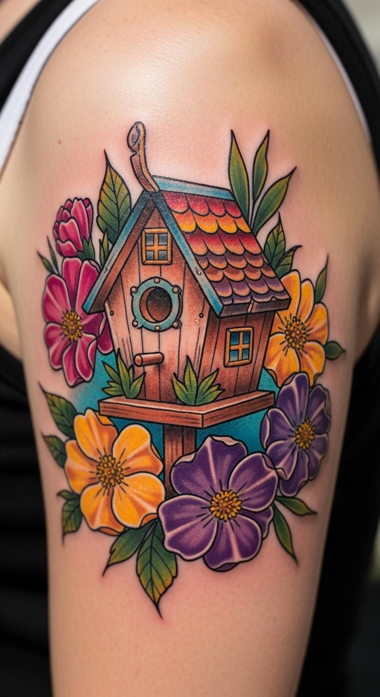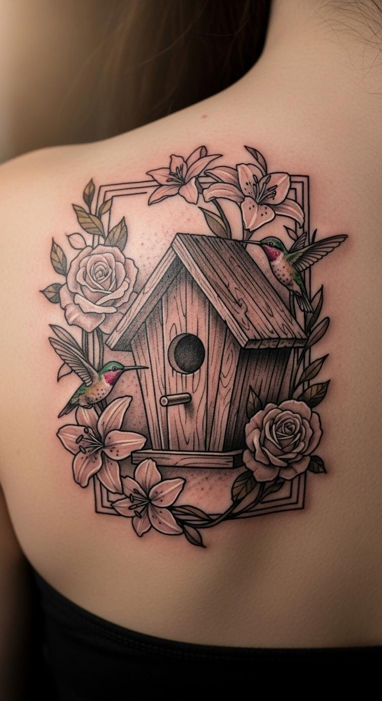 Frame the birdhouse with flowers. Put it on your shoulder blade. Gather flower images. Draw borders with markers. Use petal colors wisely. Artists can add this economically. Schedule simply. Perfect for garden vibes. Care with natural products. Test designs. Prices fit tight budgets.