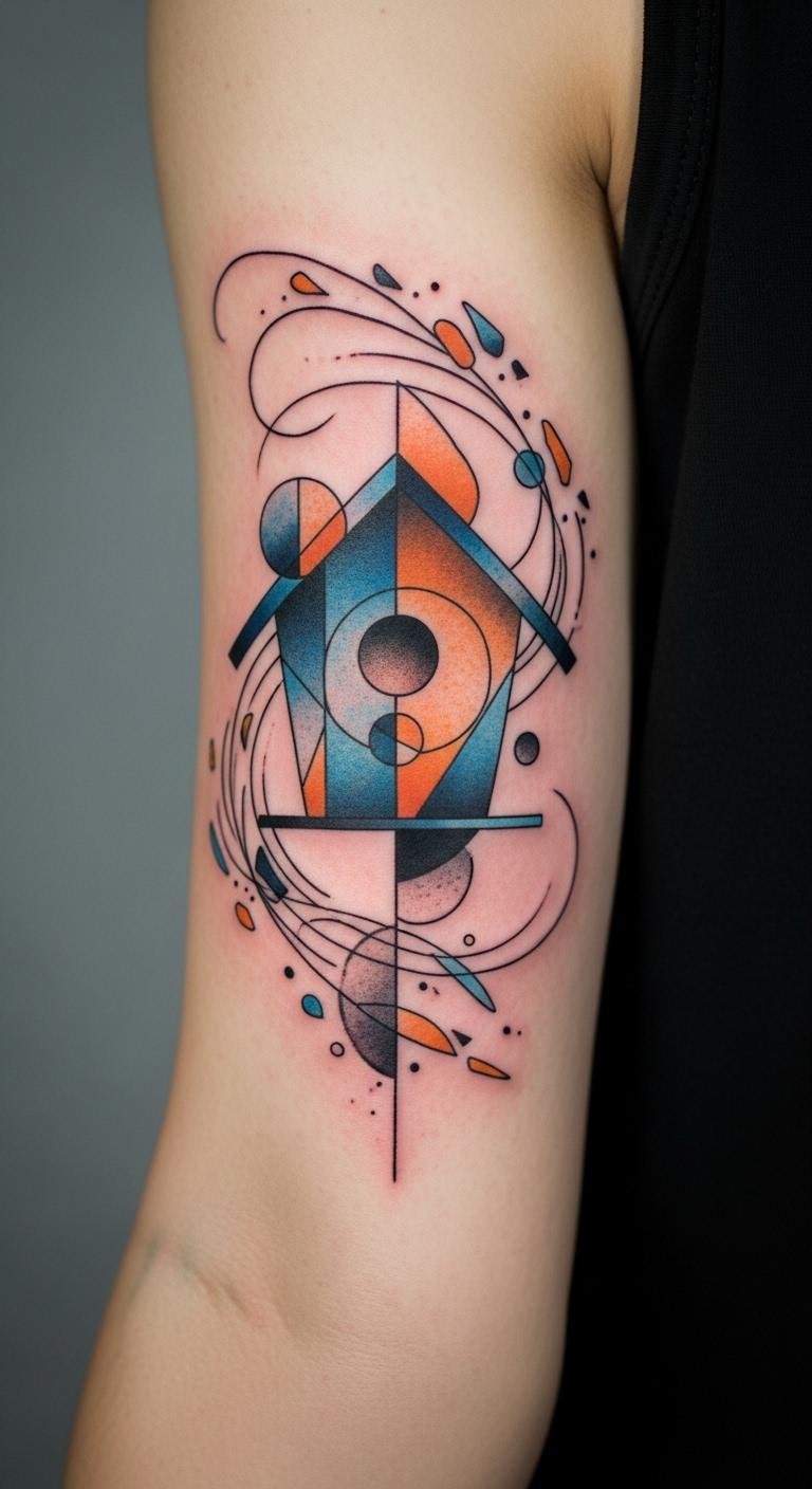 Go abstract with swirling birdhouse shapes. Place on your bicep. View abstract art for ideas. Create with free apps. Keep colors minimal. Artists adapt easily. Do in one go. Fun for creatives. Heal naturally. Experiment first. Costs remain low.