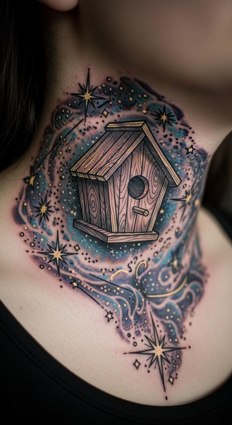 Add stars to the birdhouse for night themes. Neck placement adds edge. Star sketches are simple. Draw with a pen. Use metallic inks if possible. Quick artist sessions work. Book online. Ideal for dreamers. Use star stickers to preview. Affordable options abound.